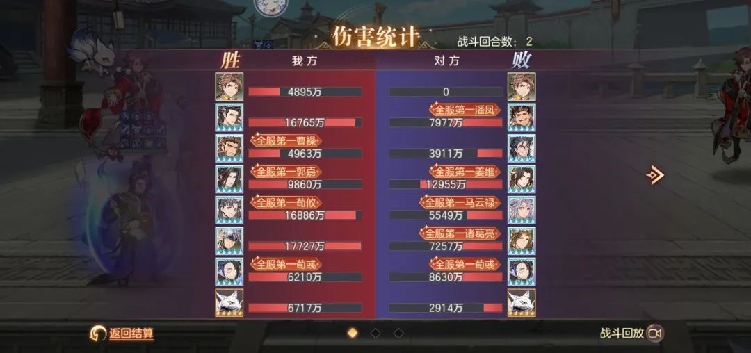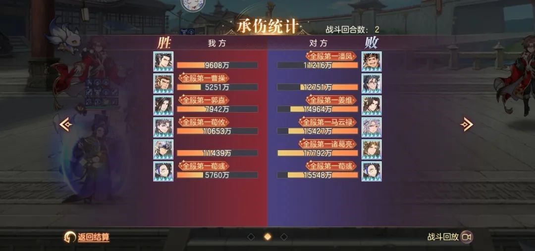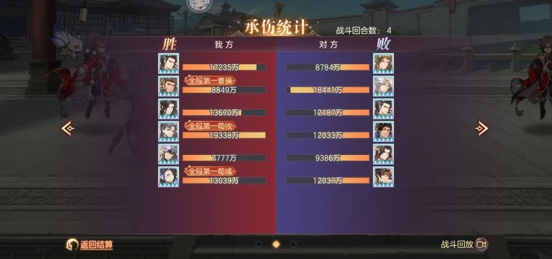多核输出,阵容暴力。战斗成功拖入四回合,从承伤可以看出战况惨烈,魏国辅助将的回血远没有对方姜维邓艾吸血来的多,承伤方面惊人就不得不说到曹丕羁绊的减伤和福牛的盾起到了至关重要的作用。