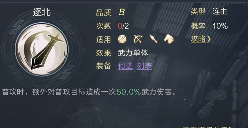 很多主公会发现,(将飞龙城)以及(烈火燎原)都是主动技能。不论是发动频率还是伤害强度,主动技能的效果都会更好。指挥技能需要有一些特定条件才可发动,而连击技发动概率太低,不优先考虑。因此,主公们在给大部分武将搭配第二技能时,最好选择主动技能。