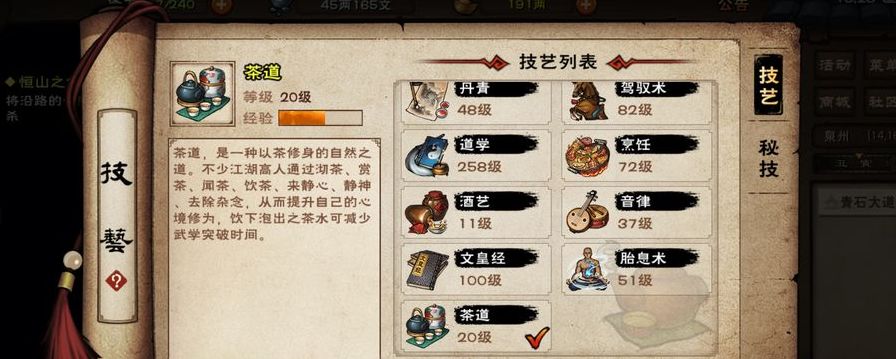 1、首先前往紫阳书院处,在商店购买茶经,使用茶经将角色的茶道等级提升到50级解锁技能。