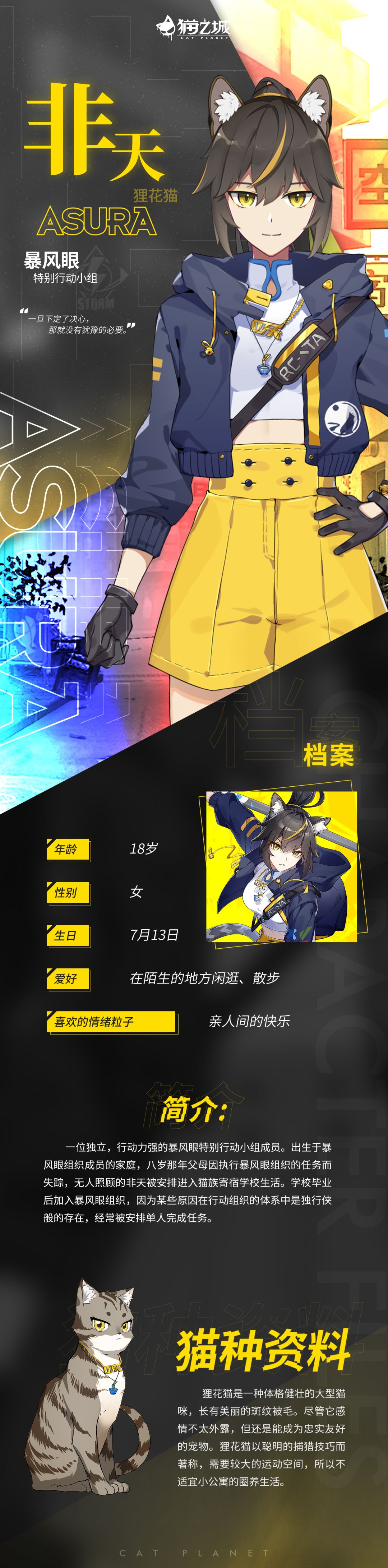 丨出生于暴风眼组织成员的家庭,八岁那年父母因执行暴风眼组织的任务而失踪,无人照顾的非天被安排进入猫族寄宿学校生活。