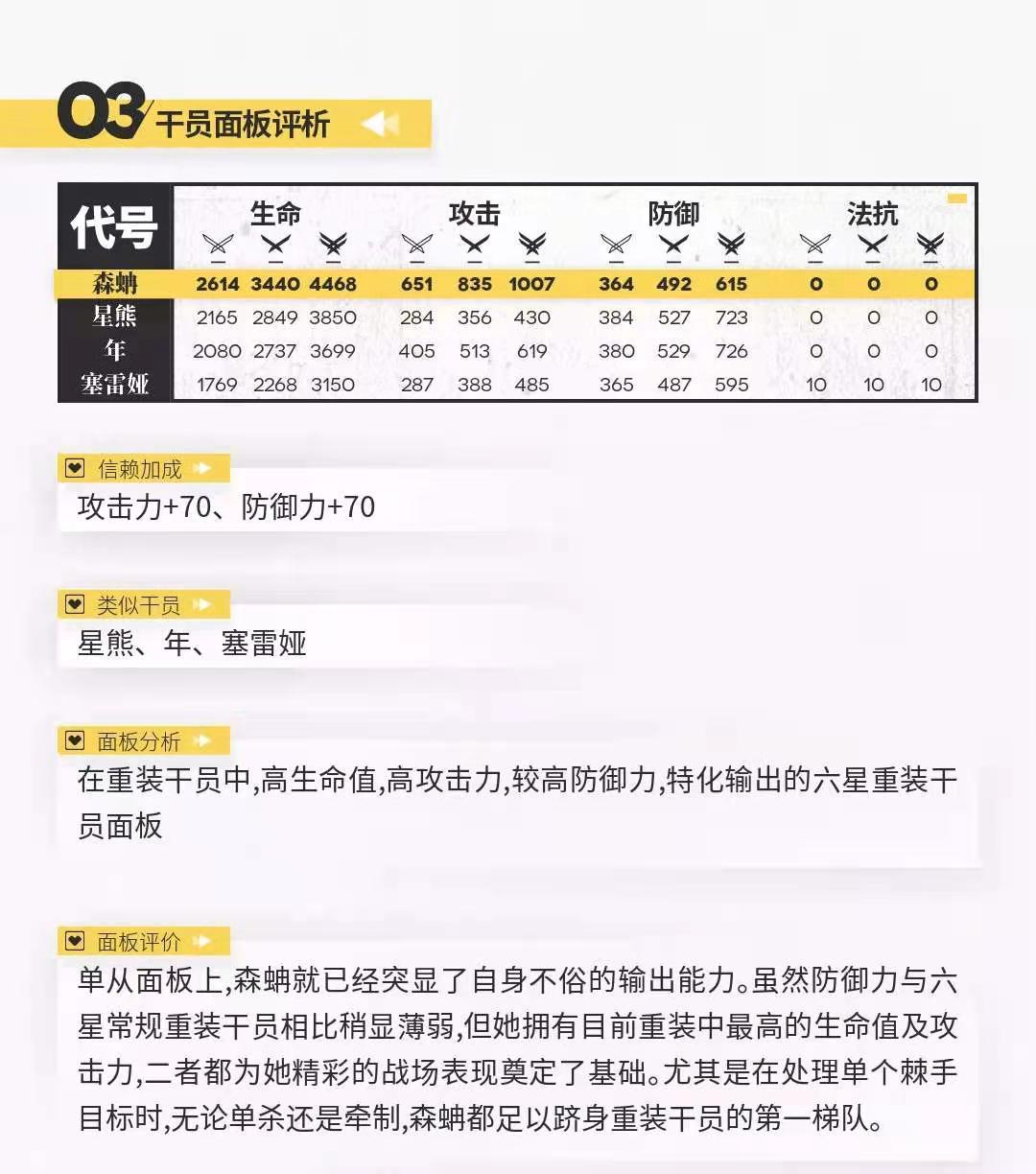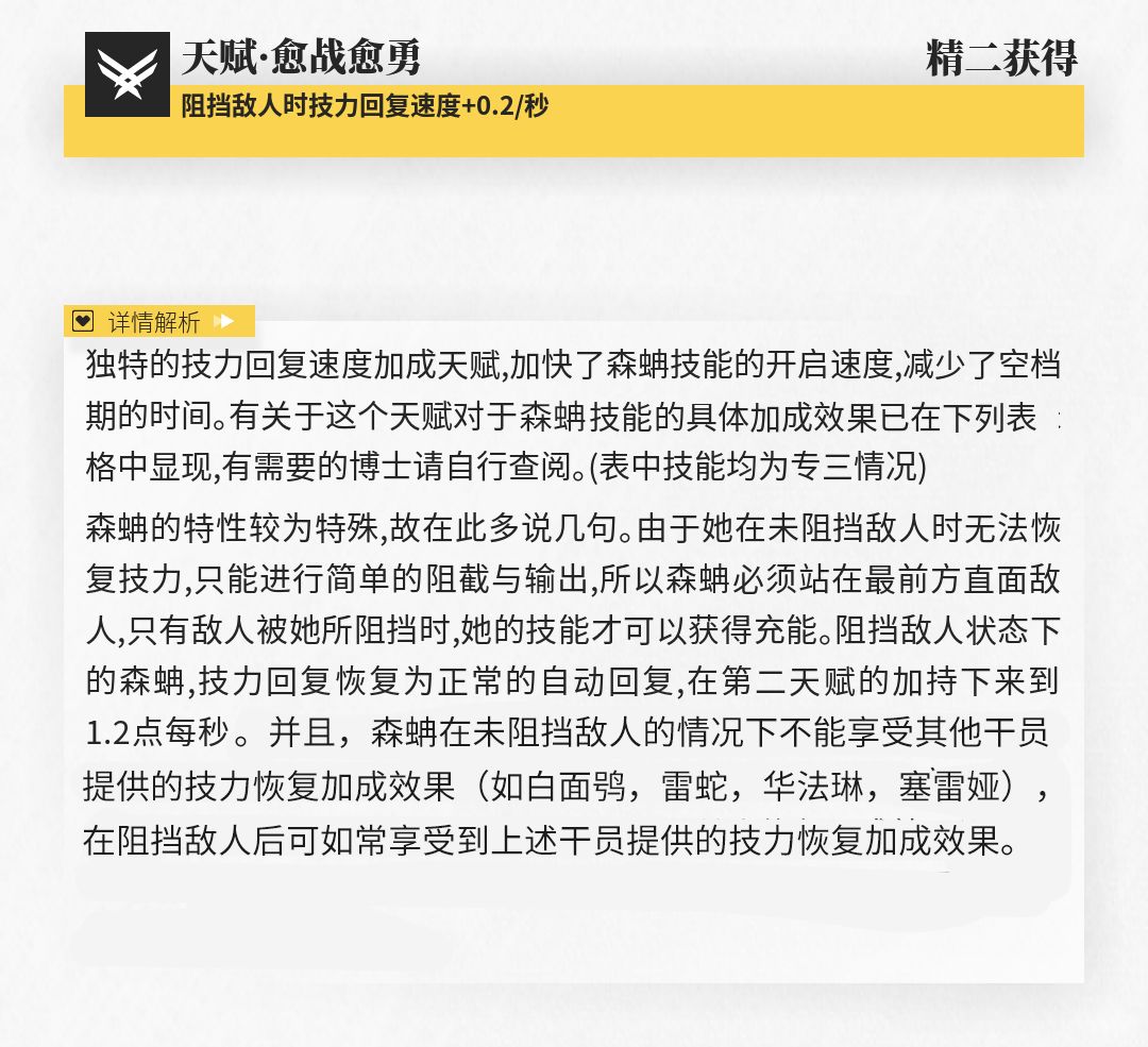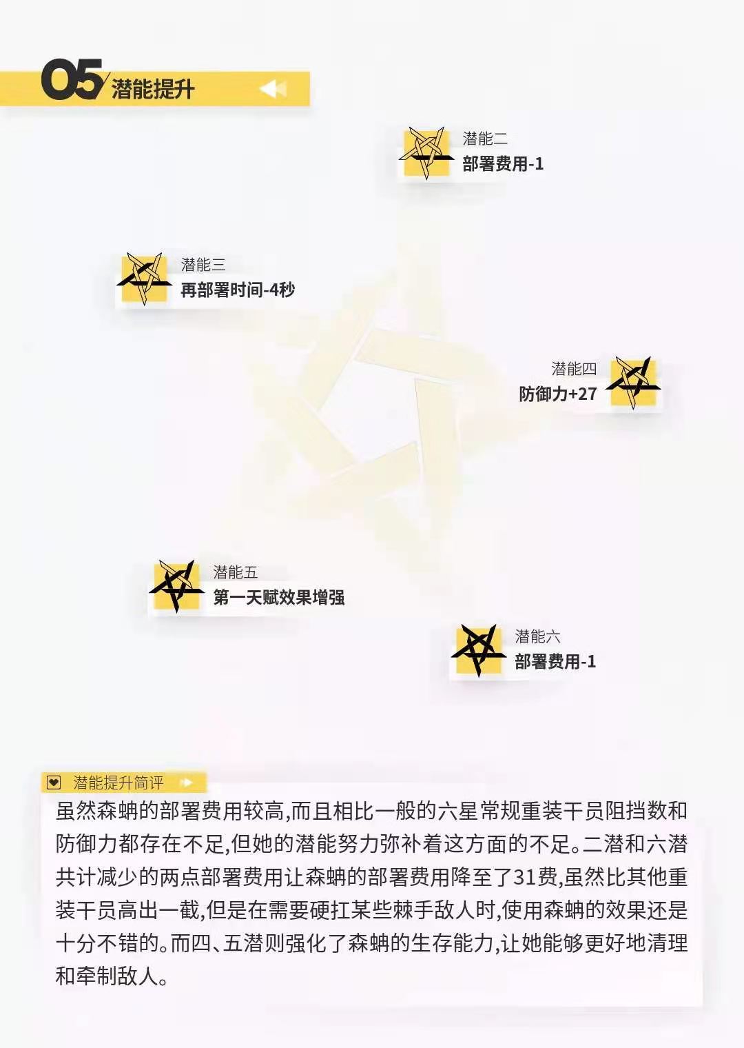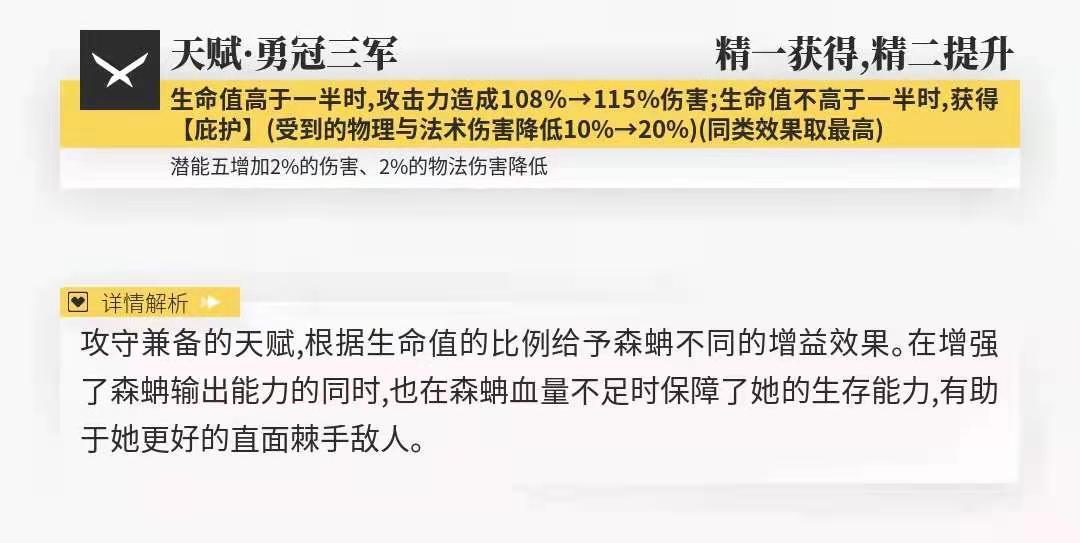 森蚺的防御力相对一般重装来说处于较低水平,或许是为了弥补这一缺陷,她的生命值还算不错,而且第一天赋可以使她在血量低于50%后减少所受伤害的22%,一定程度上保证了森蚺的生存能力。若是生存环境较为恶劣,建议让森蚺携带三技能入场,此时的她不仅拥有防御力加成,还可以获得每秒回血的buff,回复量与森蚺的高额生命值挂钩,效果相当不错。