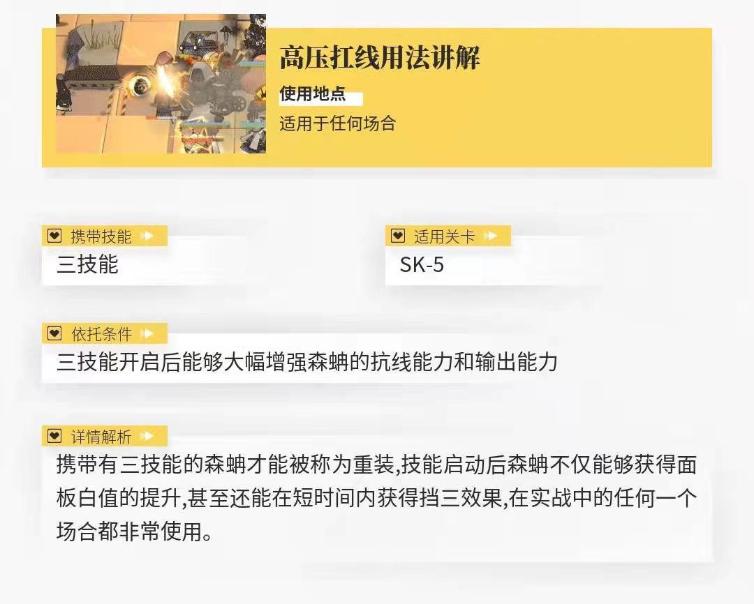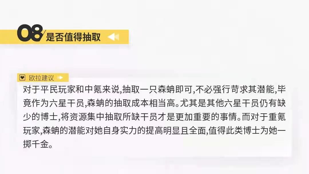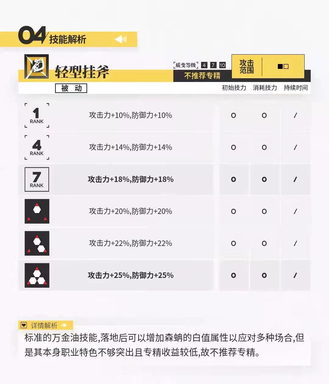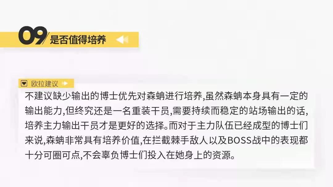 森蚺的防御力相对一般重装来说处于较低水平,或许是为了弥补这一缺陷,她的生命值还算不错,而且第一天赋可以使她在血量低于50%后减少所受伤害的22%,一定程度上保证了森蚺的生存能力。若是生存环境较为恶劣,建议让森蚺携带三技能入场,此时的她不仅拥有防御力加成,还可以获得每秒回血的buff,回复量与森蚺的高额生命值挂钩,效果相当不错。