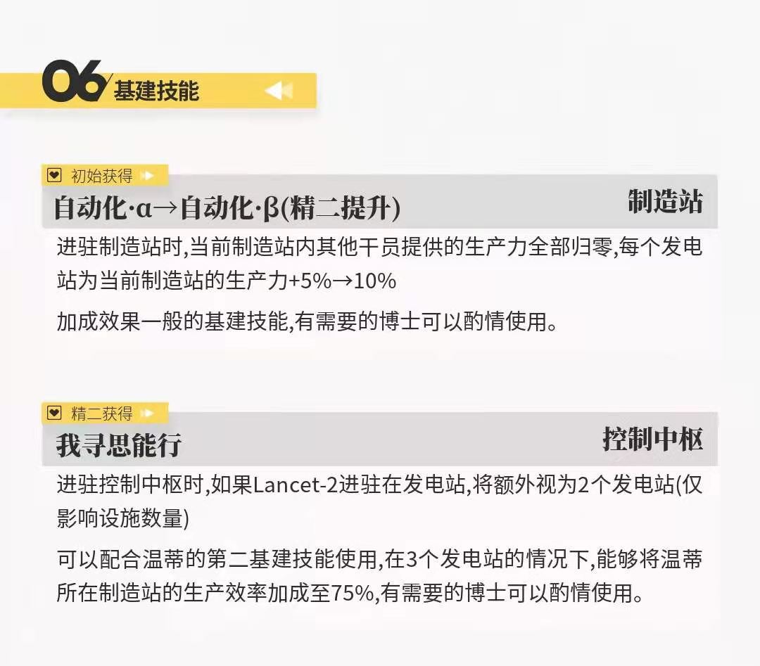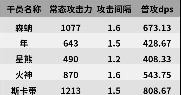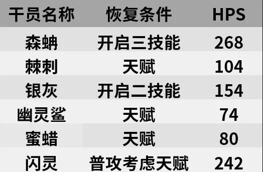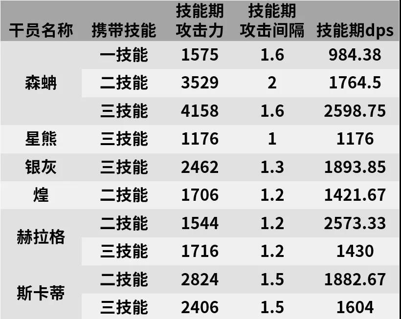 注:该模块的所有数值均为在干员精二满潜满级满专精的情况下计算。表格中所有数据所呈现的情况均为该干员的满配峰值情况,即满级、满潜、满信赖、满技能等级、满天赋加成。所有非100%概率触发的天赋不参与数值计算。所有光环类天赋仅对拥有该天赋的干员自身生效。
