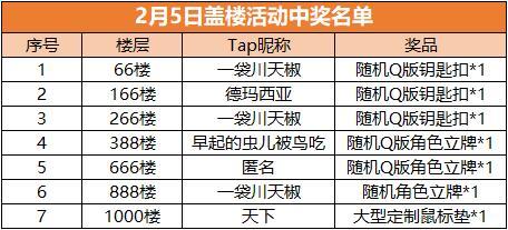 在过年前进行的1000楼盖楼挑战中,大家超出预期的提前完成了1000楼的“施工”,根据活动规则,恭喜道友“一袋川天椒”、“德玛西亚”等7位道友获得大型定制鼠标垫、随机角色立牌等精美周边好礼。