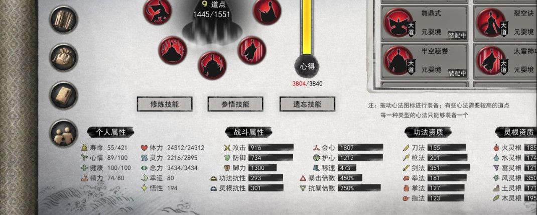 鬼谷八荒中悟性的主要作用是提高学习功法的效率,当悟性到达100后,产出“悟性球”的概率接近100%,如果悟性太低了,就容易产生“心魔球”,会非常影响功法的学习。悟性还会影响在参悟技能时候可以反悔的点数“回溯点”。