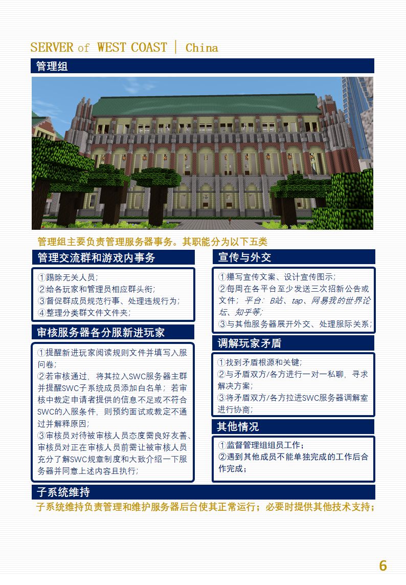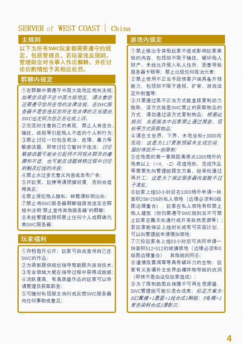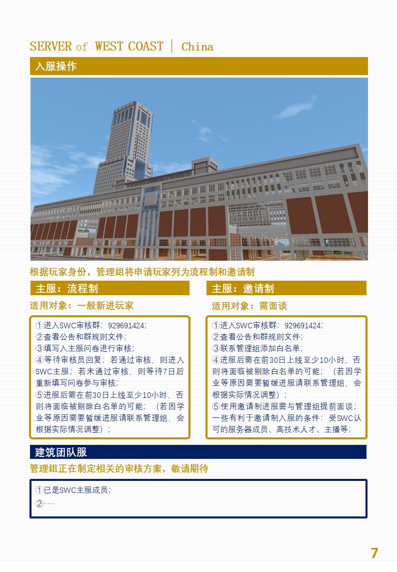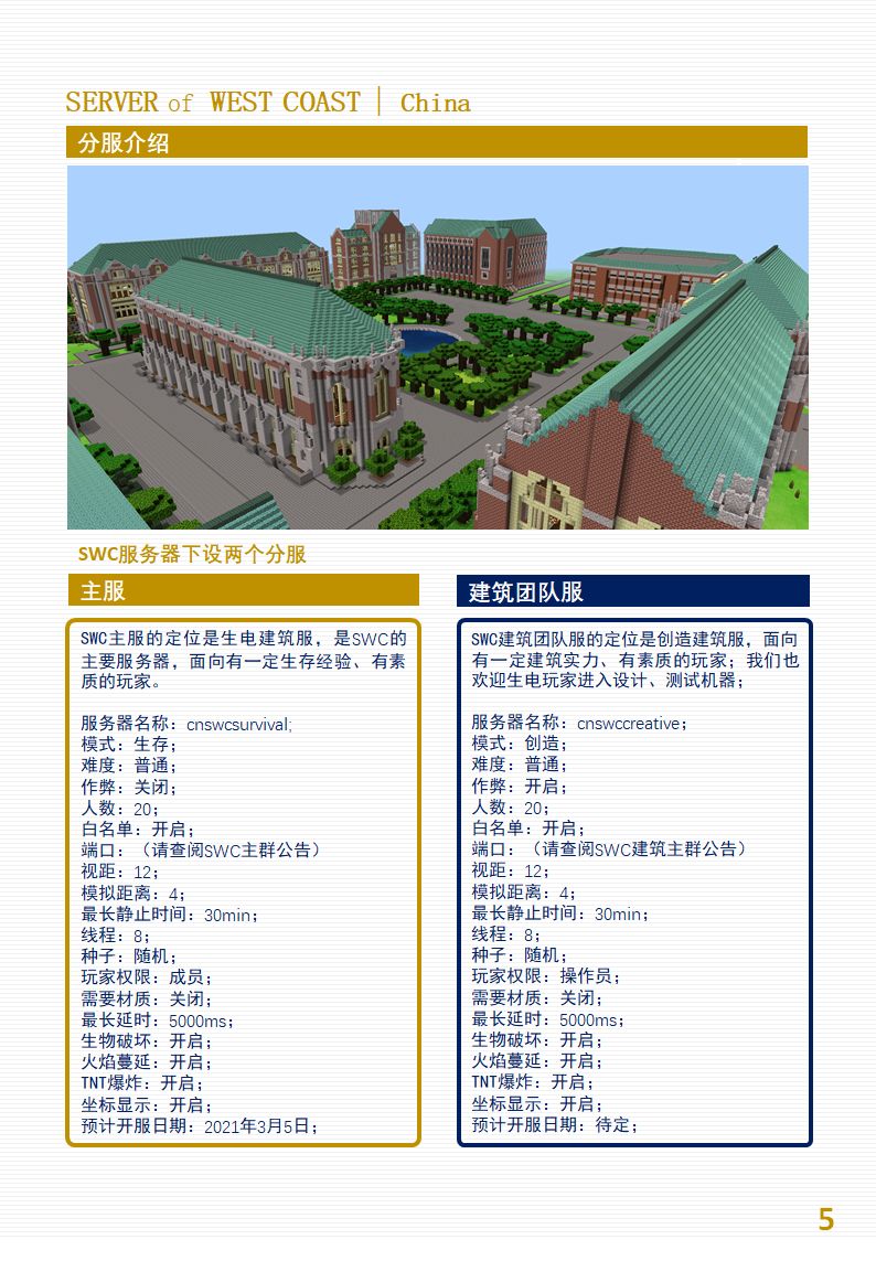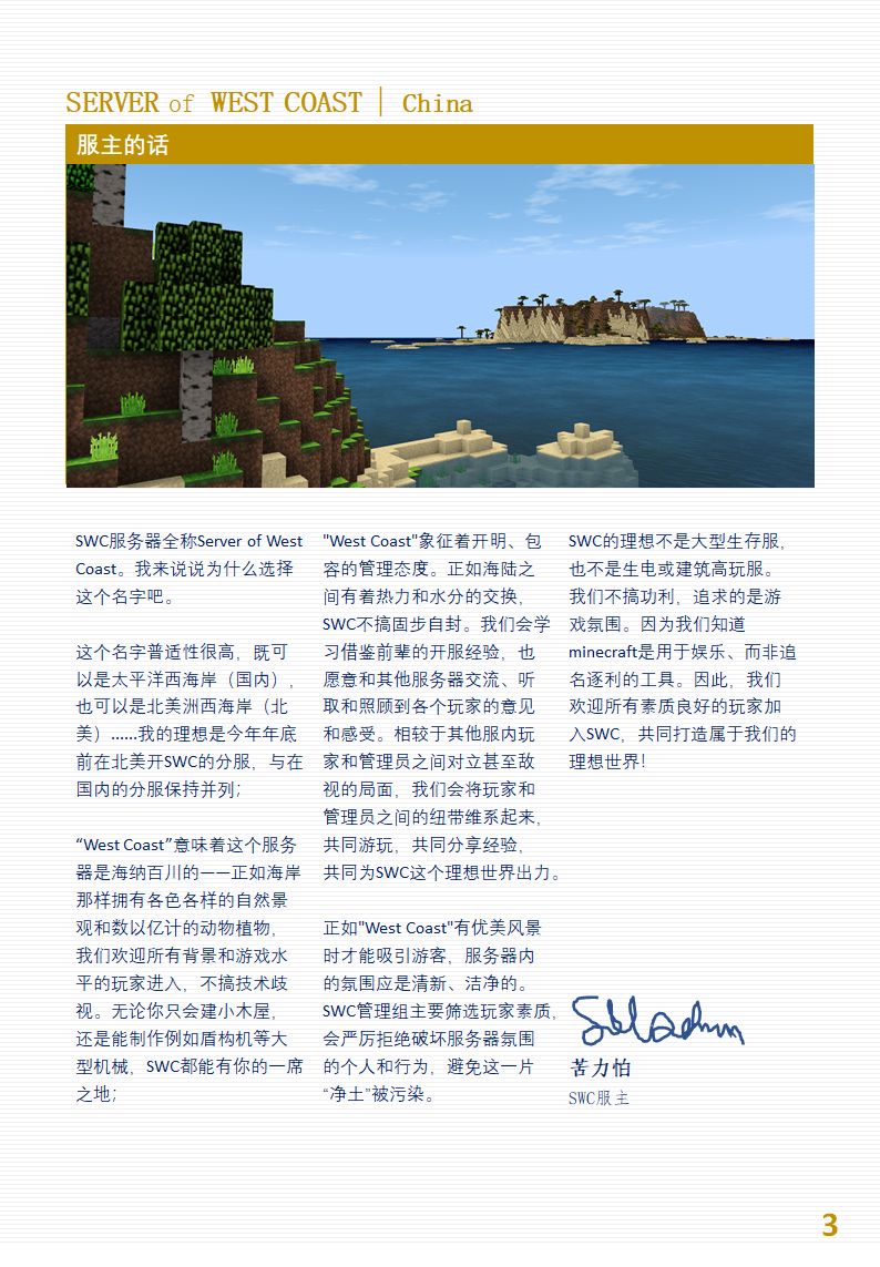 SWC分为生存主服和建筑团队服;不添加花里胡哨影响玩法的插件;坚持不搞技术歧视,欢迎各个游戏水平层次的玩家前来游玩,前提是玩家自身有足够的素质;进服之前有一个简单的面试确保服务器的安全;服务器坚持公益,不搞任何氪金,接受自愿捐款;存档每月公开;