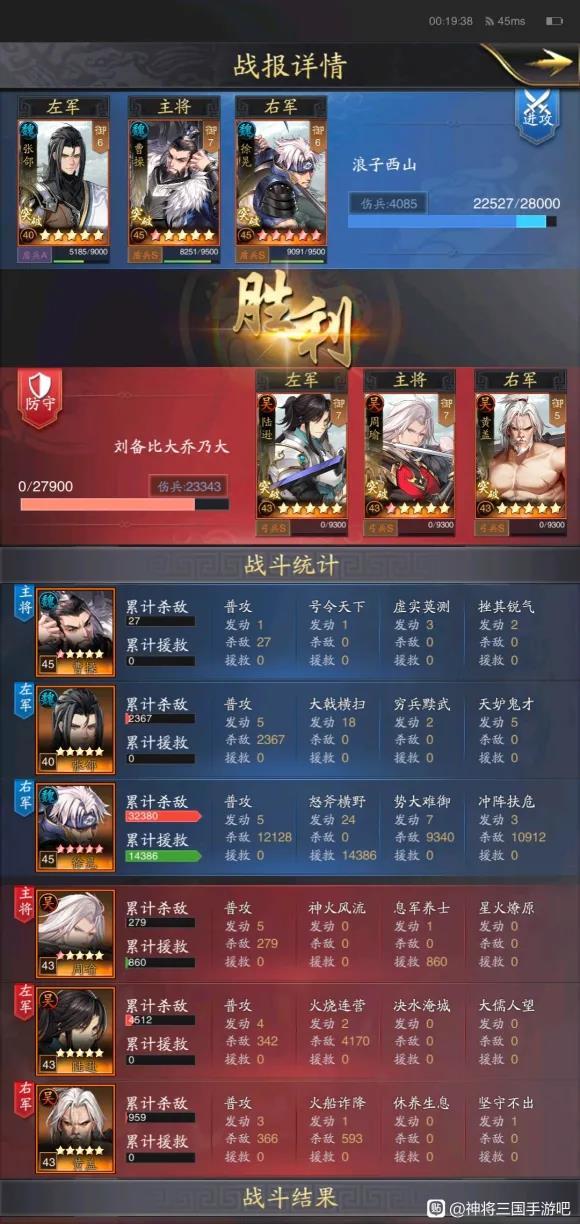 张郃在魏盾究竟有什么作用呢,答案是高概率守御(平均一局28-35次,恐怖如斯),高加成普攻伤害,徐晃输出是高,但他输出在没有张郃的情况下,输出非常拖后,基本是40-50s结束战斗,也就导致于战损较高 而加入张郃后,徐晃一场普攻傲世群雄,将续航和输出提前发挥到极致的武将张郃,又怎么不适合回复能力不理想的魏盾呢,武技方面基本绑死天妒+穷兵黩武,天妒高概率降低对面触发在我看来十分有用,穷兵黩武15s全体减法伤+追击加成完美适用,s1穷兵黩武可用两个减伤武技代替
