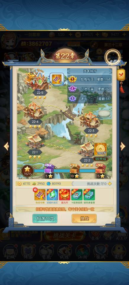 这个游戏由于武将、装备、宝石等等都需要从低合起,所以慢慢的金币就开始缺了,所以在扫荡完合成令牌之后,如果不想花元宝买次数,那么就可以继续扫荡出金币的副本