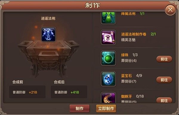 制作高级装备需要低级装备+高级装备制作卷轴+制作材料才可完成。装备品阶依次为降魔装备、逍遥装备、朱雀装备...