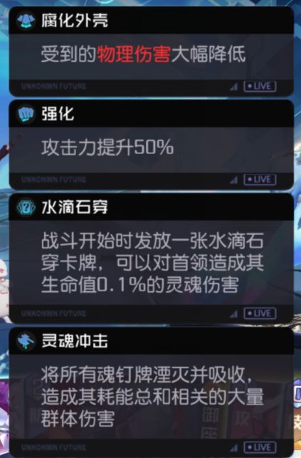 这是boss在局内的buff,大家可以看到第一个buff,从第二个boss开始就会有这类型的护盾buff,受到的精神/物理伤害大幅度降低,而阿帕忒的是物理输出降低,所以我们还是要选择精神类角色进行输出~