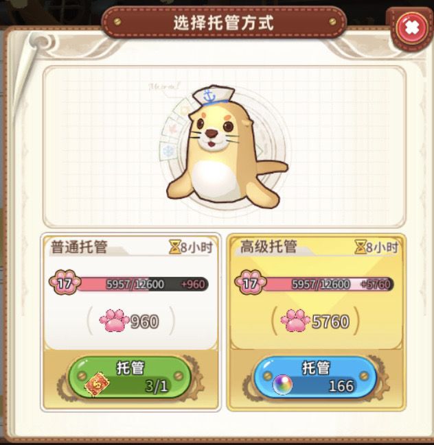 2、宠物商人处可进行托管。需要消耗宠物托管券或者使用托管消耗对应的珍珠进行托管,2种托管时间为8小时,托管中心最多托管6只宠物,30、40、50、55、60级解锁对应寄养数。