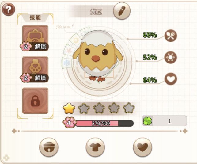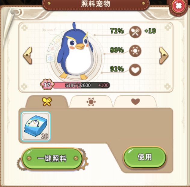 1、宠物的饥饿值为刀叉标识,宠物饲料进行回复;宠物的心情值为太阳标识,宠物玩具进行回复;宠物的清洁值为爱心标识,宠物清洁刷进行回复。