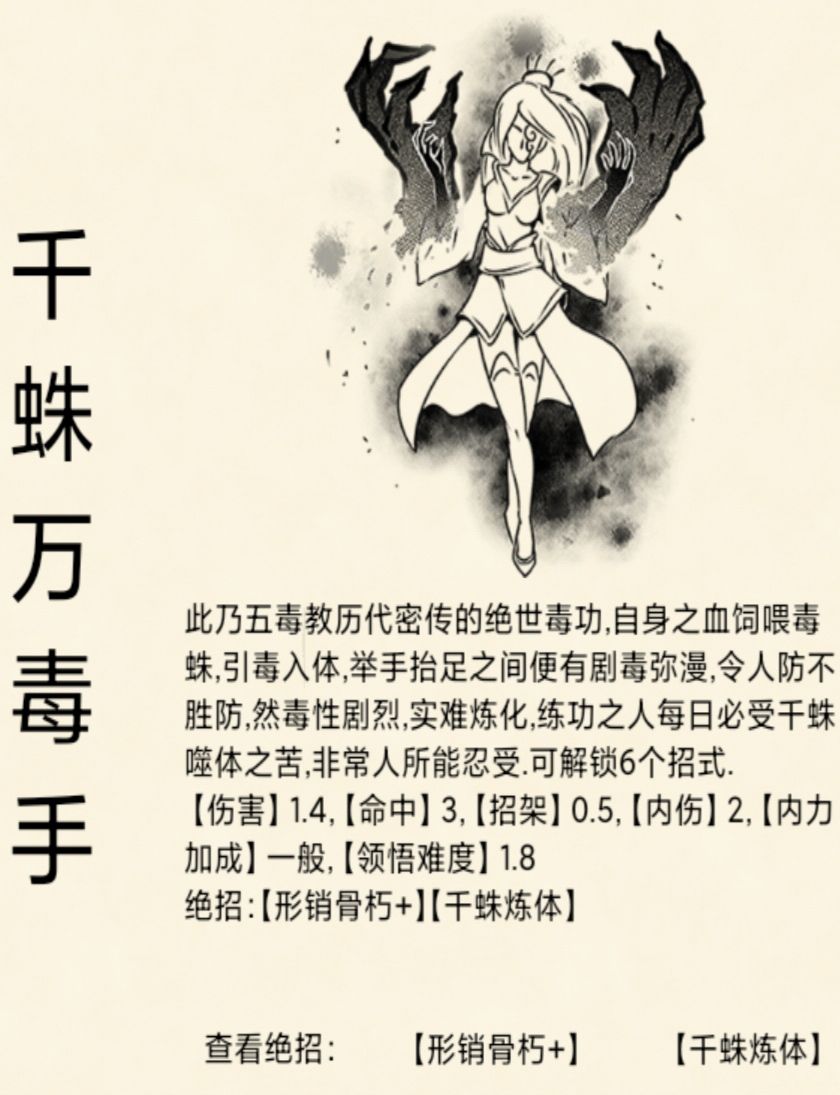 评价:北冥克星,相对于易筋经,更惧怕九阳,毕竟易筋经缺少续航,在后期僵持回合久的情况下,千蛛可以靠九阳耗死易筋经。