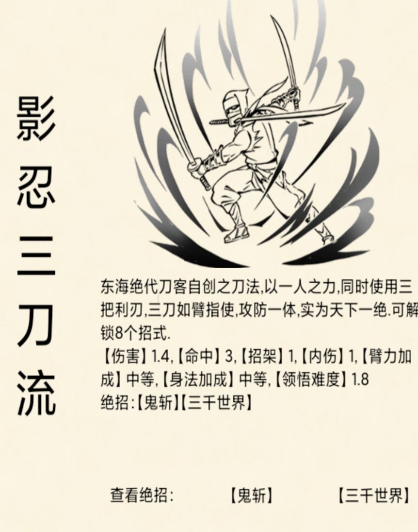 推荐搭配:三刀+九阳/九三/易筋经+血影步/疾风步/三花。