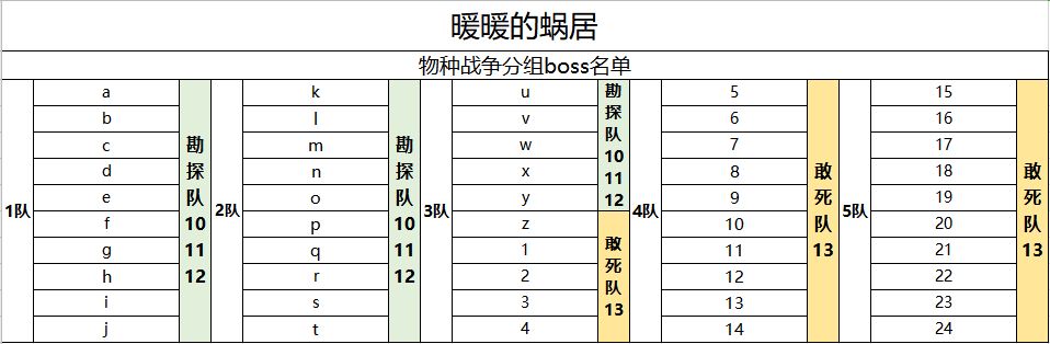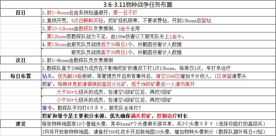 ● Boss攻坚:第一天由低战的勘探队负责9、10、11、12区的Boss(目前我区自动勘探机挖到8区),其中12区的Boss 3队的敢死队限用一次金令完成● 第二天勘探队负责清理1-8区的Boss,并且根据战损情况考虑攻坚13区Boss 1至2次。而敢死队队员主要负责攻打13区的Boss