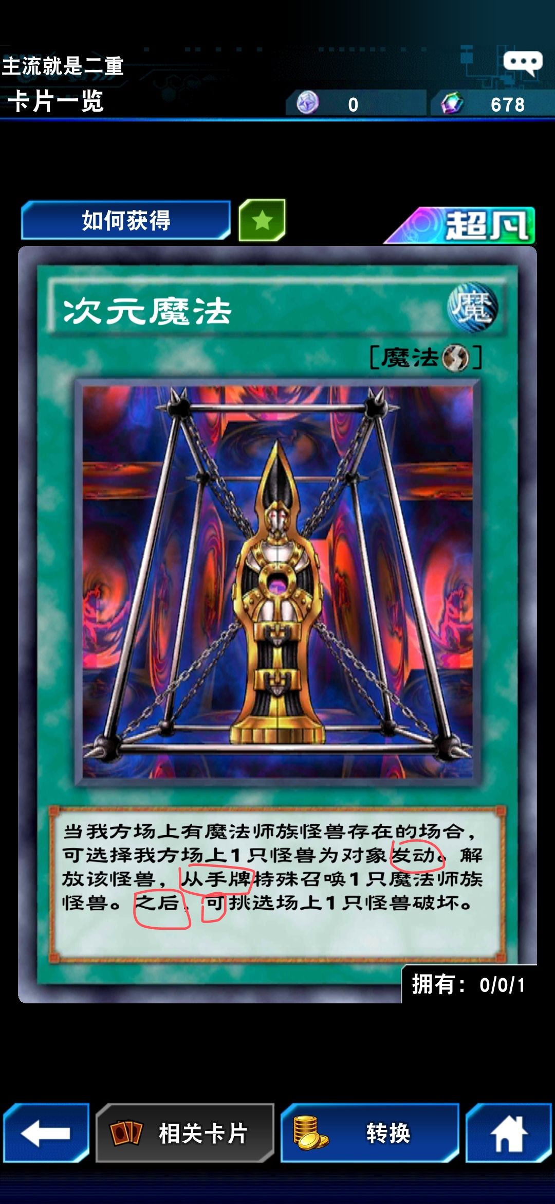 跟前面两张有不同,次元魔法的发动条件需要场上有魔法族怪,手里有魔法师怪才能发动。但再往后的描述里有个"可"字,这个就不是必须满足的条件了,可破坏可不破坏。这里需要注意,次元魔法最迟可在战斗阶段发动,不能在伤害判定阶段发动,也就是说得比镜壁/锁链早发,实战中如果不确定对面后场是否盖的伤判陷阱,那就趁早发动