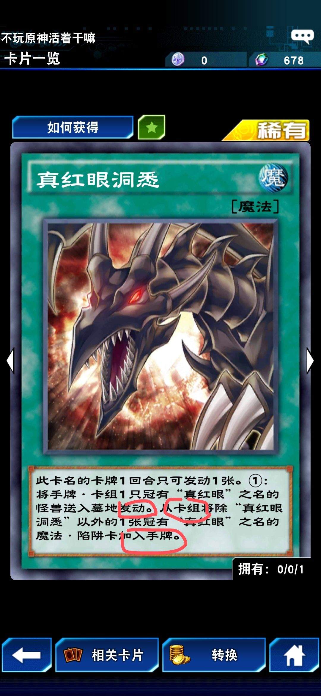 我继续翻其他类似说明的卡,看到了真红眼洞悉,同样在“发动”后面还有需要满足的效果,汇总来说,就是手牌/卡组得有"真红眼"怪兽,同时卡组里还要有"真红眼"魔陷才行(目前就是指的灵魂)。