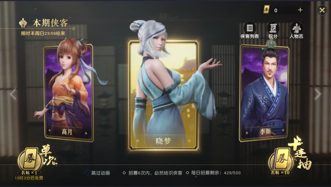 侠客是一个氪金和不氪金可以拉开很多差距的地方。招募所需的名帖为100元/10次,没有稳定保底橙色。所以说要注意看是否需要适当换号