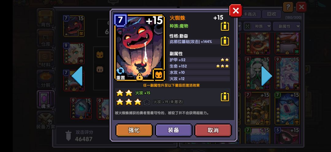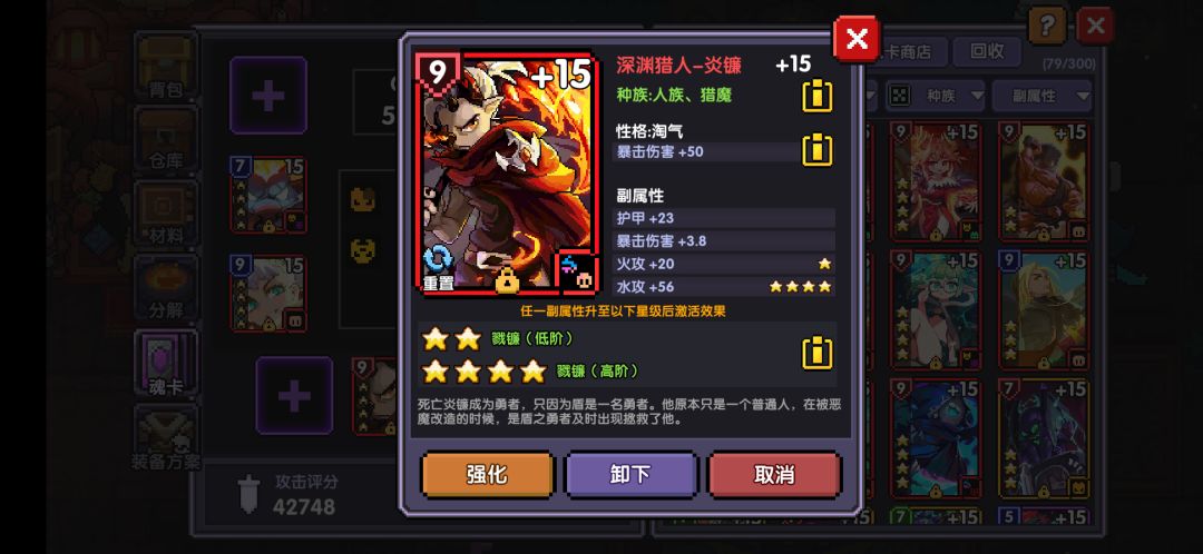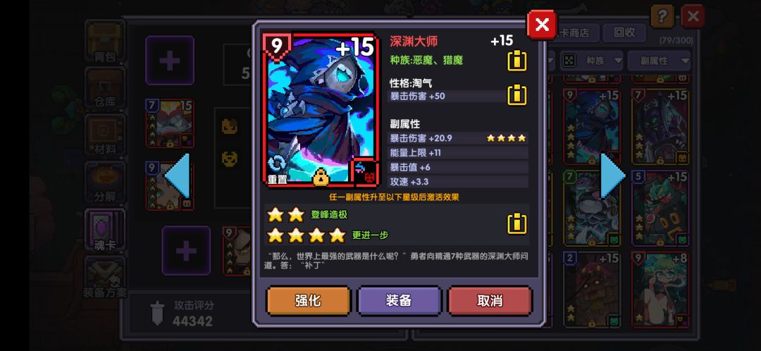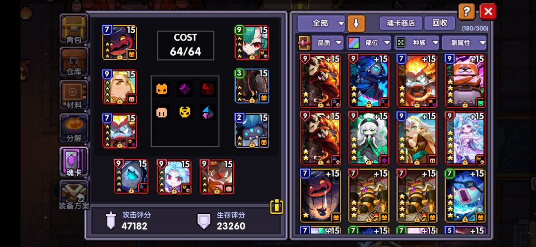 原则上来说凑齐四魔物,四人族羁绊。5张组队必备卡,4张可调整卡,属性应该都懂,强调一下安朵斯要元素穿主属性。所有卡副属性有爆伤的要爆伤,没爆伤的要水攻,此外,强烈建议主卡副属性凑20攻速,原因会在后面说。