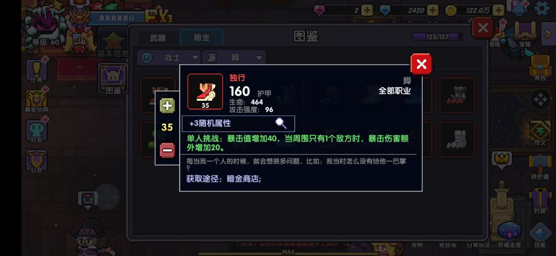 怎么说呢,鞋子中宝石鞋子的800攻强虽然是临时攻强,在进行属性调整后还是比前两种好很多,组队用不习惯宝石的推荐独行。属性水攻、穿透