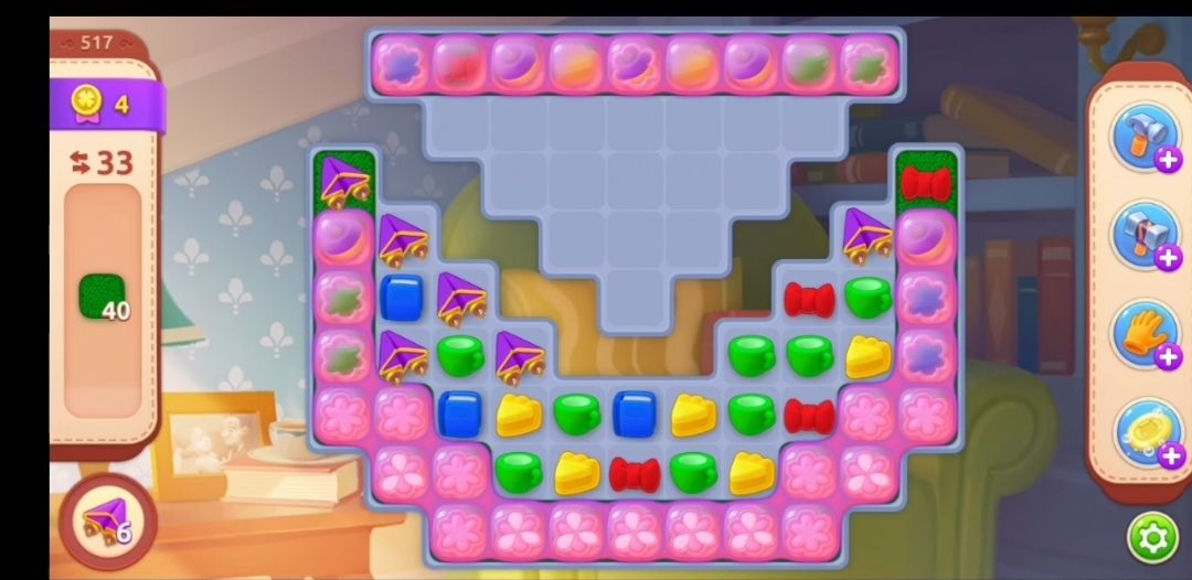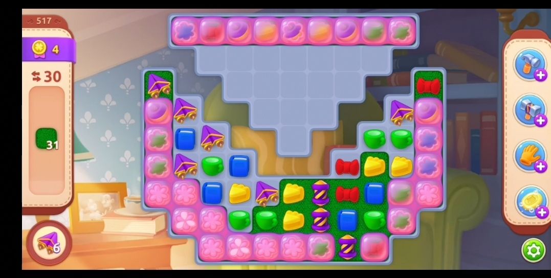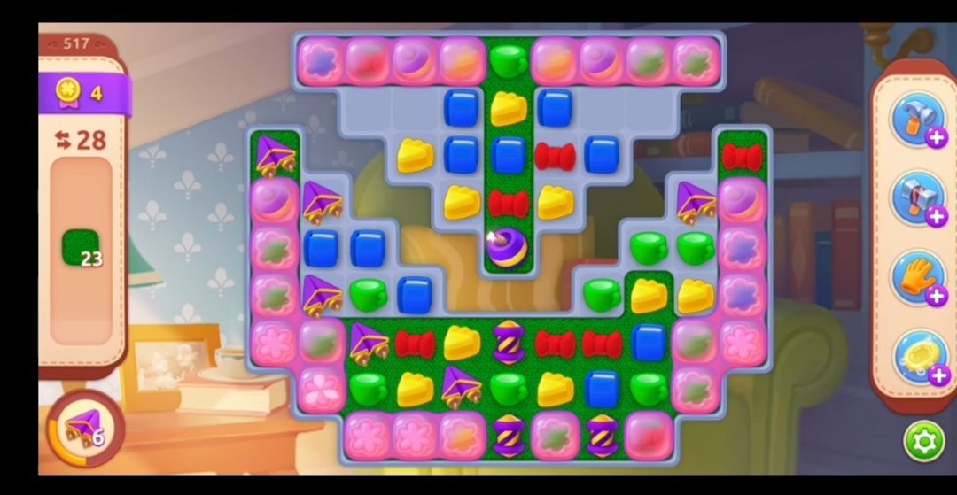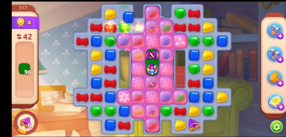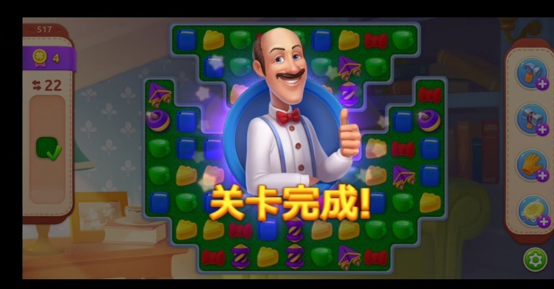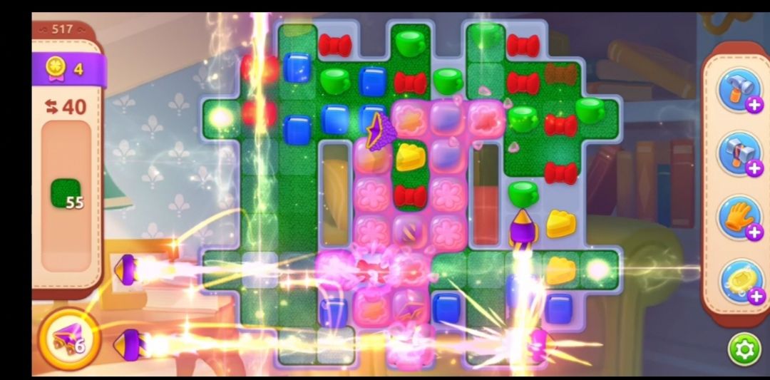 横向火箭上面的果冻消除了,利用彩虹球和横向火箭交换,满屏的横竖火箭,这样一来,第一场景的草坪基本完成