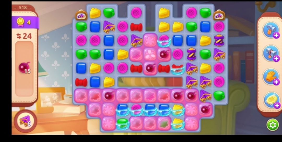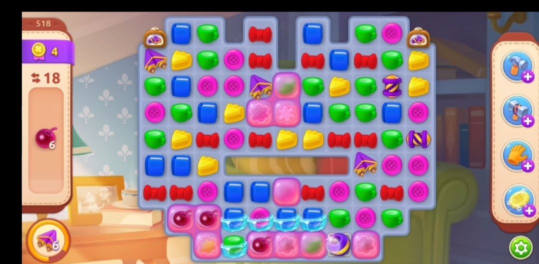 利用掉落的道具,快速消除障碍物,释放出樱桃,这些果冻障碍物还是比较厚的,一次是不能炸开的