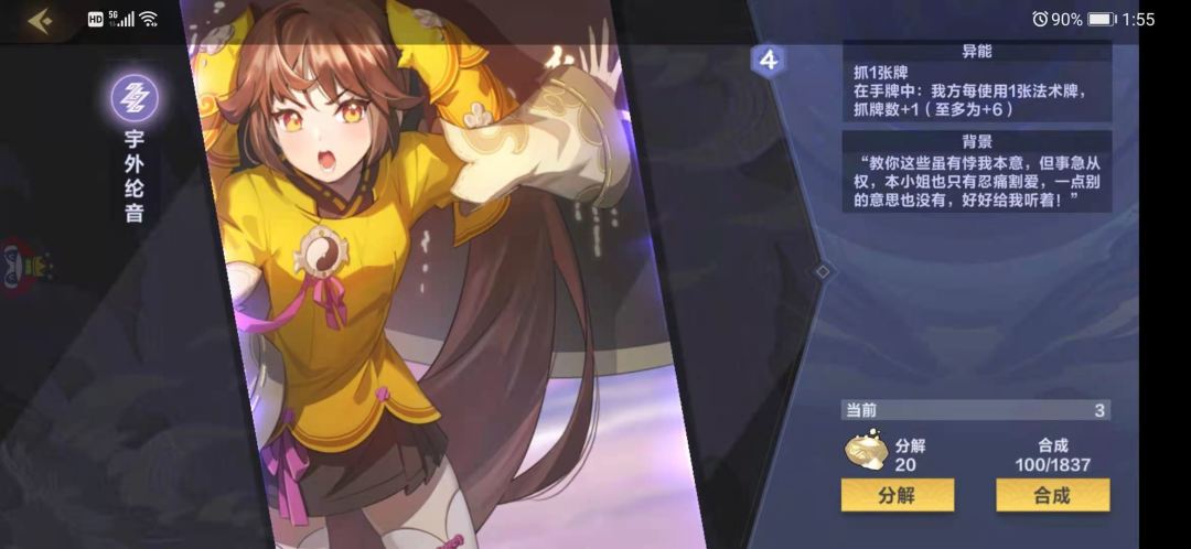 本家紫卡部署,433身材,连击,进攻前获得一张法术牌,这张卡怎么说呢,看起来很美好,但实际用起来并不理想,本身身材比较差,连击特效大多情况是A不出第二下的,3点场攻还1张法术,费用还需要4点,还是紫卡,emmmm,只能说不是特别实用吧,不是很建议带,有人可能说可以配合5费法术雷动化身+4/+4,我想说太理想化了,本身雷法就不依靠大属性的部署,而且就算打出来,人家想解也是很轻松的,刷法术也没必要靠她。