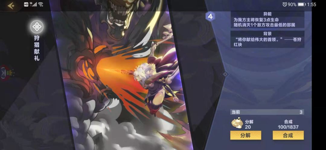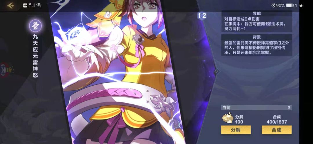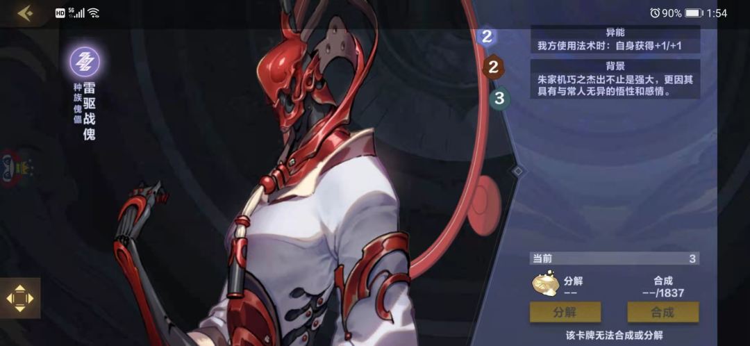 本家红卡,1077,上场对敌方全体部署打3,所有手牌减1费,在收卡中每次使用法术减1费,红卡的强度还是很高的,上场自带aoe,在手中还能不断减费,6-7费下场问题不打,中期压制力还是很高的,有的话建议带,当然,没有也关系,毕竟这张卡对于雷法来说也是锦上添花的,不是必不可少的