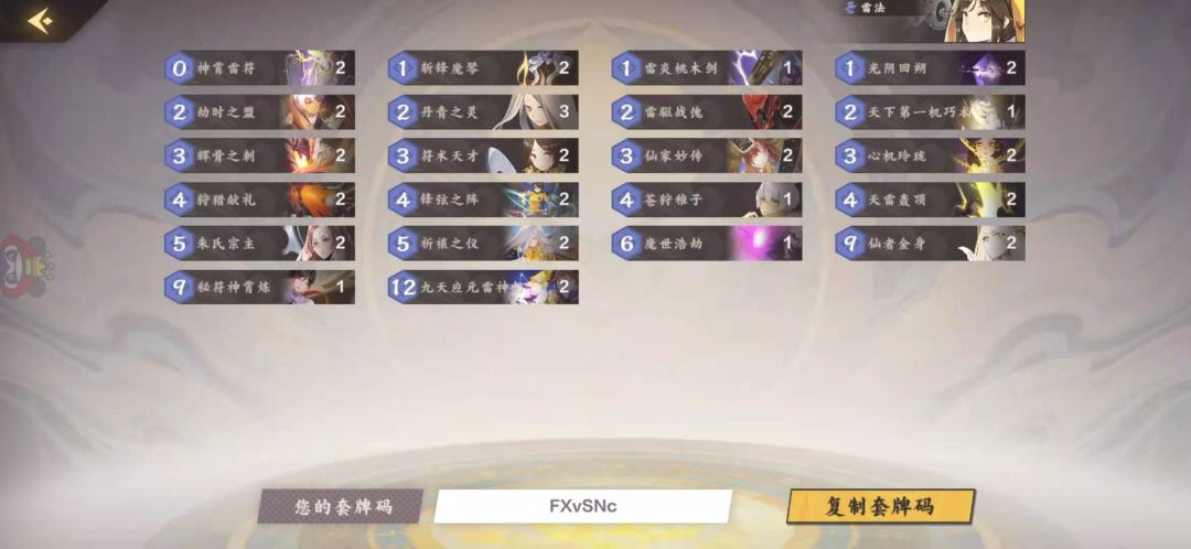 以上就是针对楼主这套卡组的一些单卡的讲解以及雷系常用部件的介绍,喜欢雷法的玩家可以进行参考,至于应对不同卡组的对战,这套卡对慢速中速都是优势64开甚至73开,只要中期刷法术刷起来蹭对面血后期双神雷+五雷轰顶斩杀就可以了,针对快攻,则起手需要留琴、傀儡、雷符,对快攻核心点是前期不能亏太多节奏,随从能换就换,该卖的果断卖掉,拖到6费大招清场之后节奏就会慢慢进入自己的掌控了。