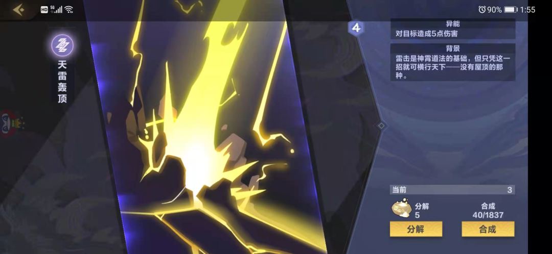 4费本家白卡法术,随机对地方部署造成1点伤害,重复3次,在手卡每用1次法术增加1次重复次数,法术版宗主,强度较高,上限很高下限不亏,结合雷法体系,很轻松能实现2-3费出手,打4-6点伤害,前期解场十分好用,后期解大哥也很不错,不过本身雷法是不缺解场法术,因此入几张就见仁见智了