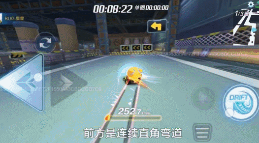 通过障碍物后,就是连续直角弯路段,先使用拖漂的技巧通过第一个弯道,出弯时立刻衔接反向漂移进入下一个弯道,落地后再次同向漂移,快速集满一个氮气。