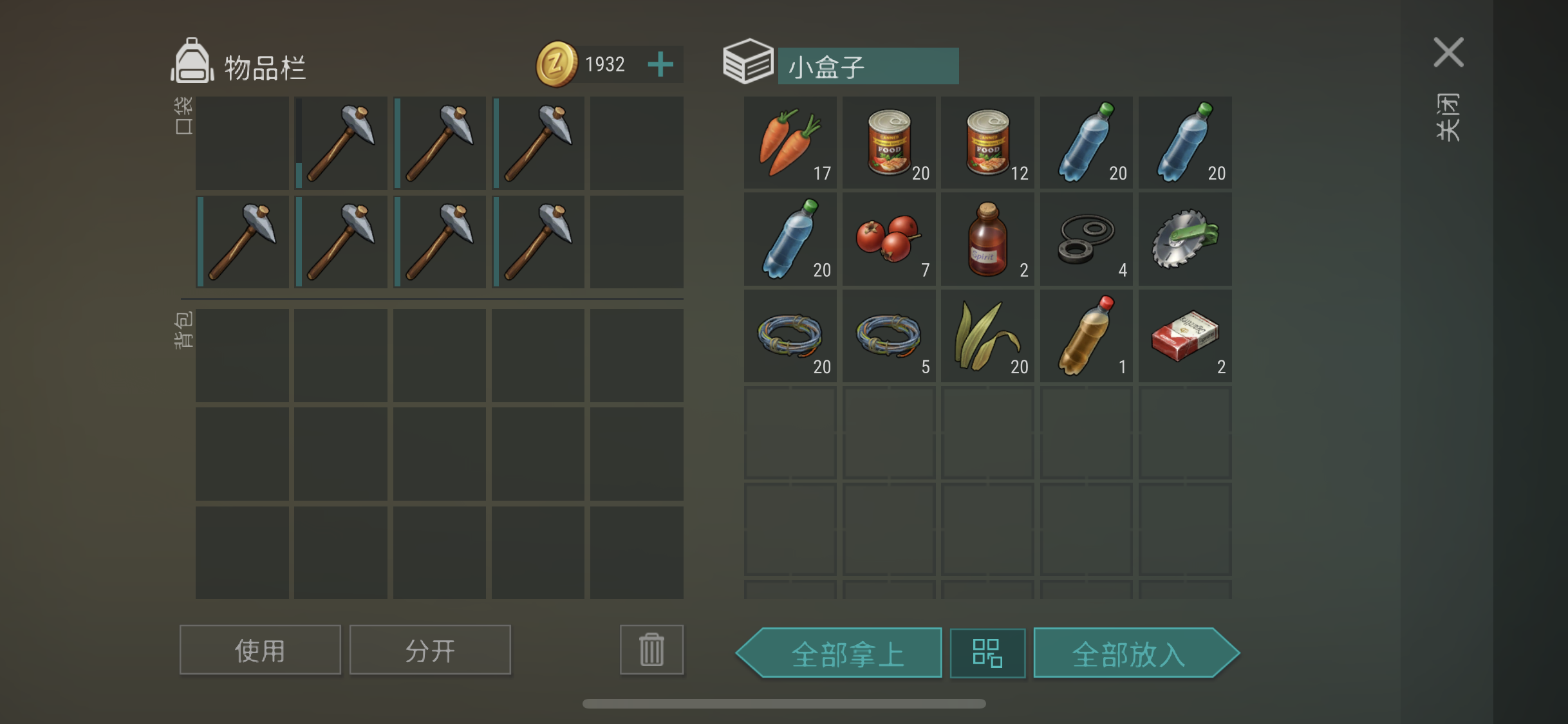 一把铁斧头五六把石头斧子(看你要不要砍工作台)看在不要C4的份上,抄一下吧……外侧工作台不要砸没东西,里面那个有木头和板材,没枪没冷兵器,就这么点基础资源。