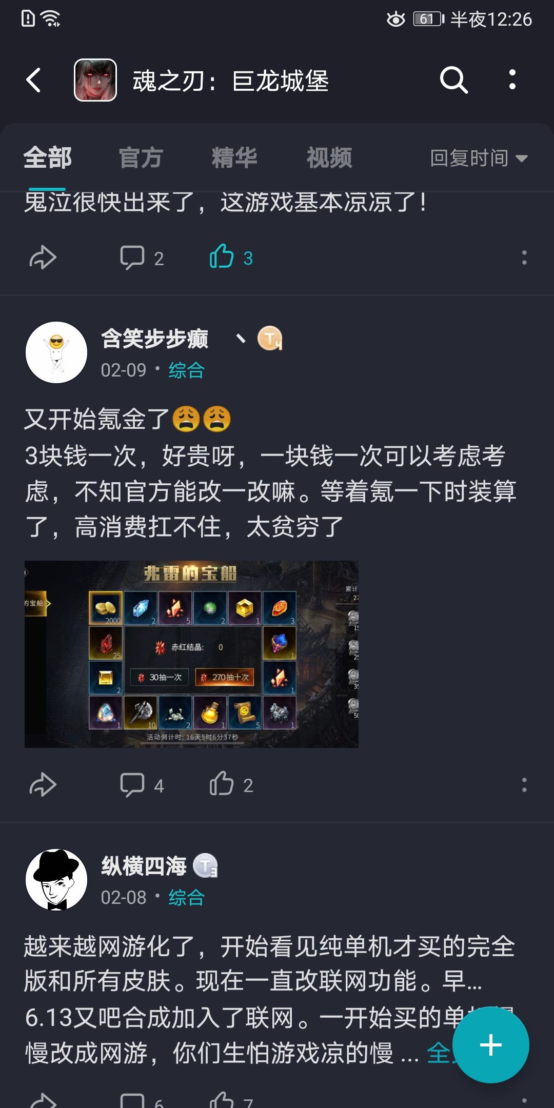 自己看吧,我就不说了,动不动就封号,这是明摆着强制把魂一的玩家改造魂2,有用吗?玩家的心已经死了,你移得过去吗???盘古我你给个回答,不需要你回答,玩家有会的,相信我,凉凉,迟早的事