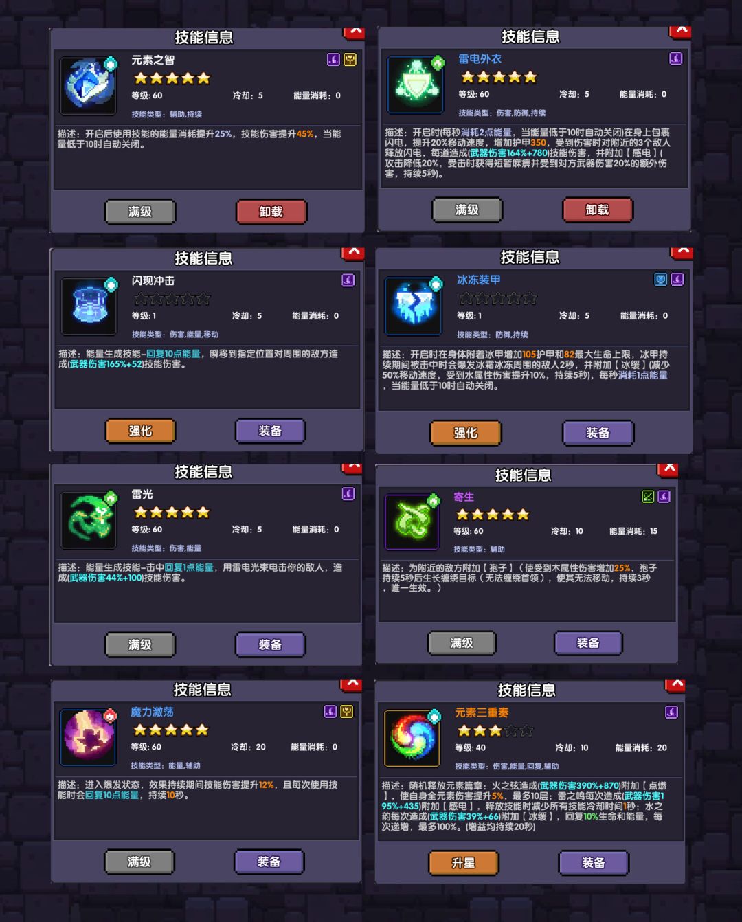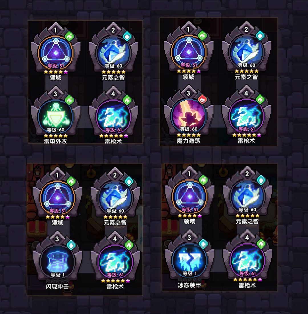元素三重奏:前期运气好能弄到,不需要升级或者刻意去弄这个技能,结合加伤、减CD、回血回蓝、控制为一体的实用性较强的技能。