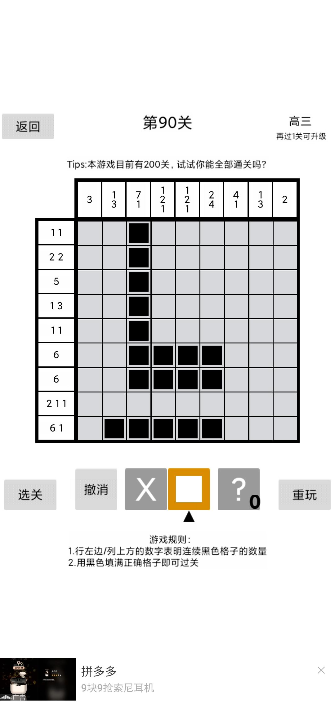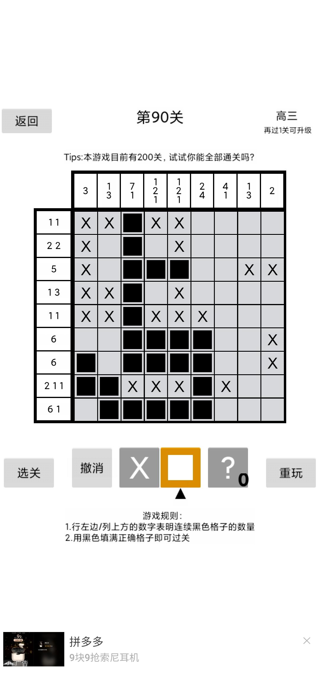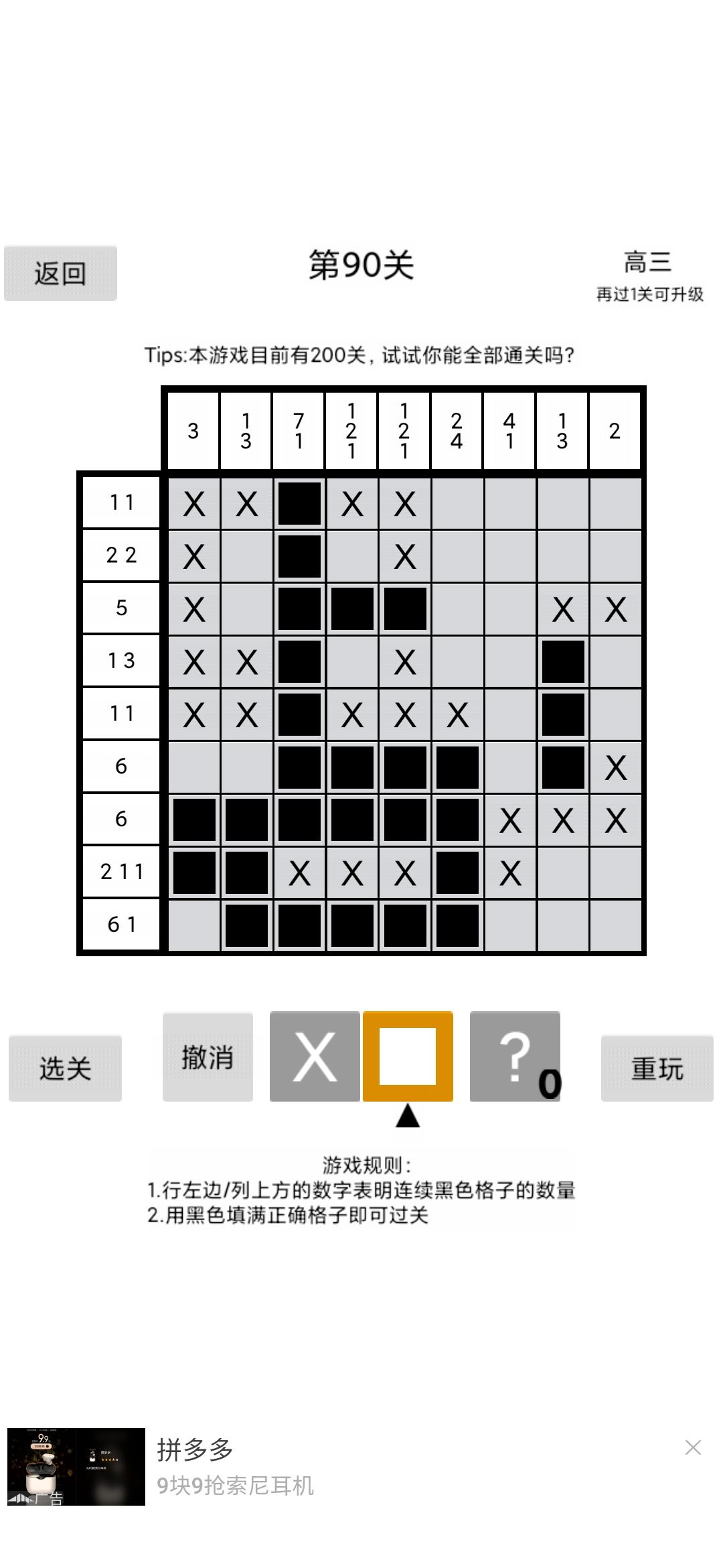 5.连续。当一定区域内只存在连续黑格,且已知两黑格位置,可以中间区域必为黑格。(如在连续8格中,只存在连续5黑格,且2,6为黑格,则3,4,5也为黑)