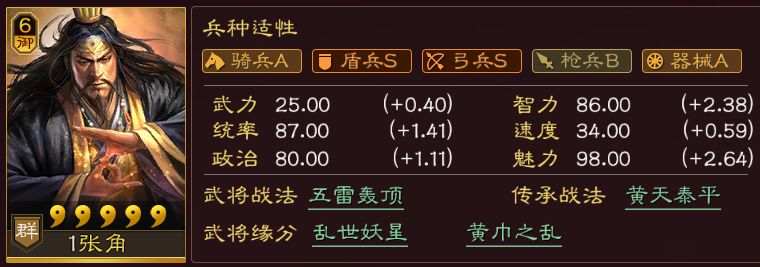 张角的面板几乎是一个标准的“短腿法师”面板:几乎没有的武力值跟速度,加上中等统率,高智力。这样的属性也注定了张角要想发挥最大的能量,就要走高续航的套路,后手爆发型的武将,永远要强调先生存后输出。