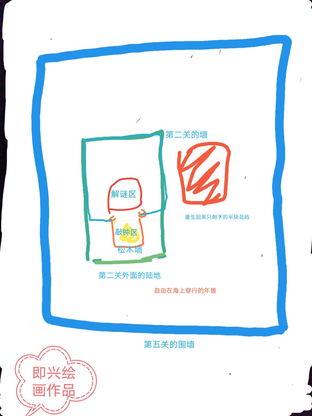 半拉岛,没有留声机,我没用完的布和船还有唱片也都在消失的那边[嗒啦啦2_哭],不过万幸还有一艘船在,划船转了一圈,只顾着震惊了,地形没截图,于是瞎画了个示意图