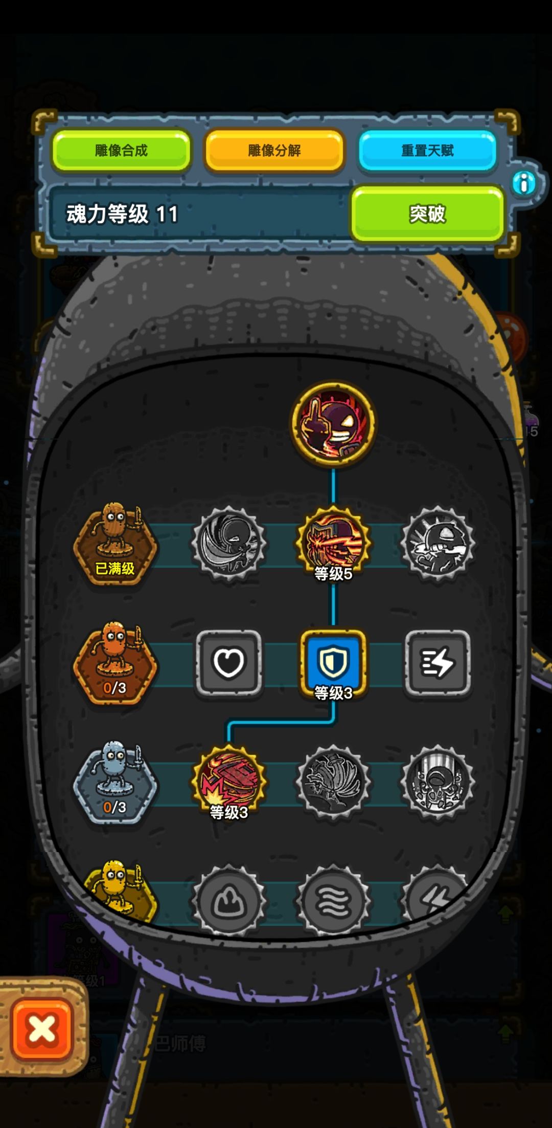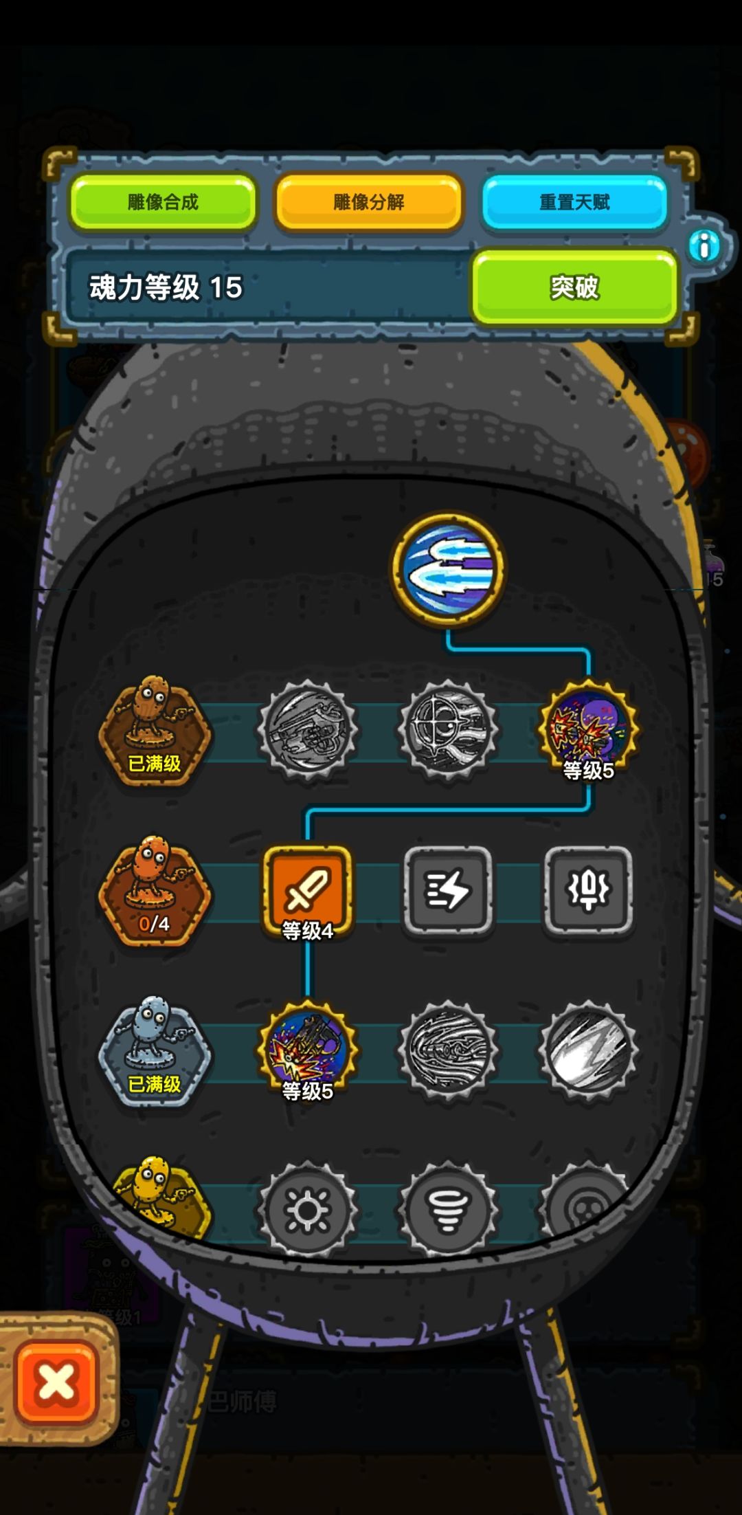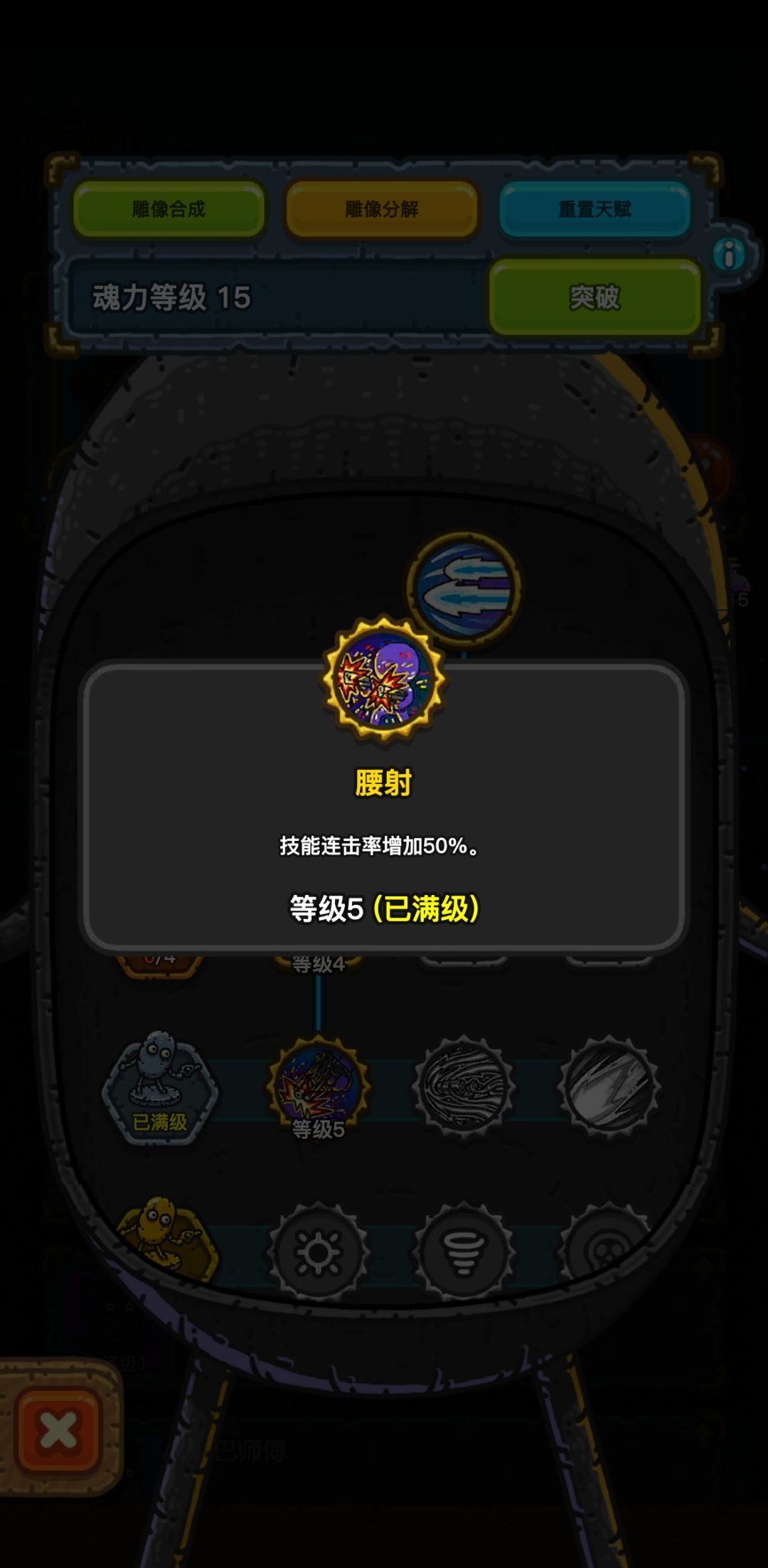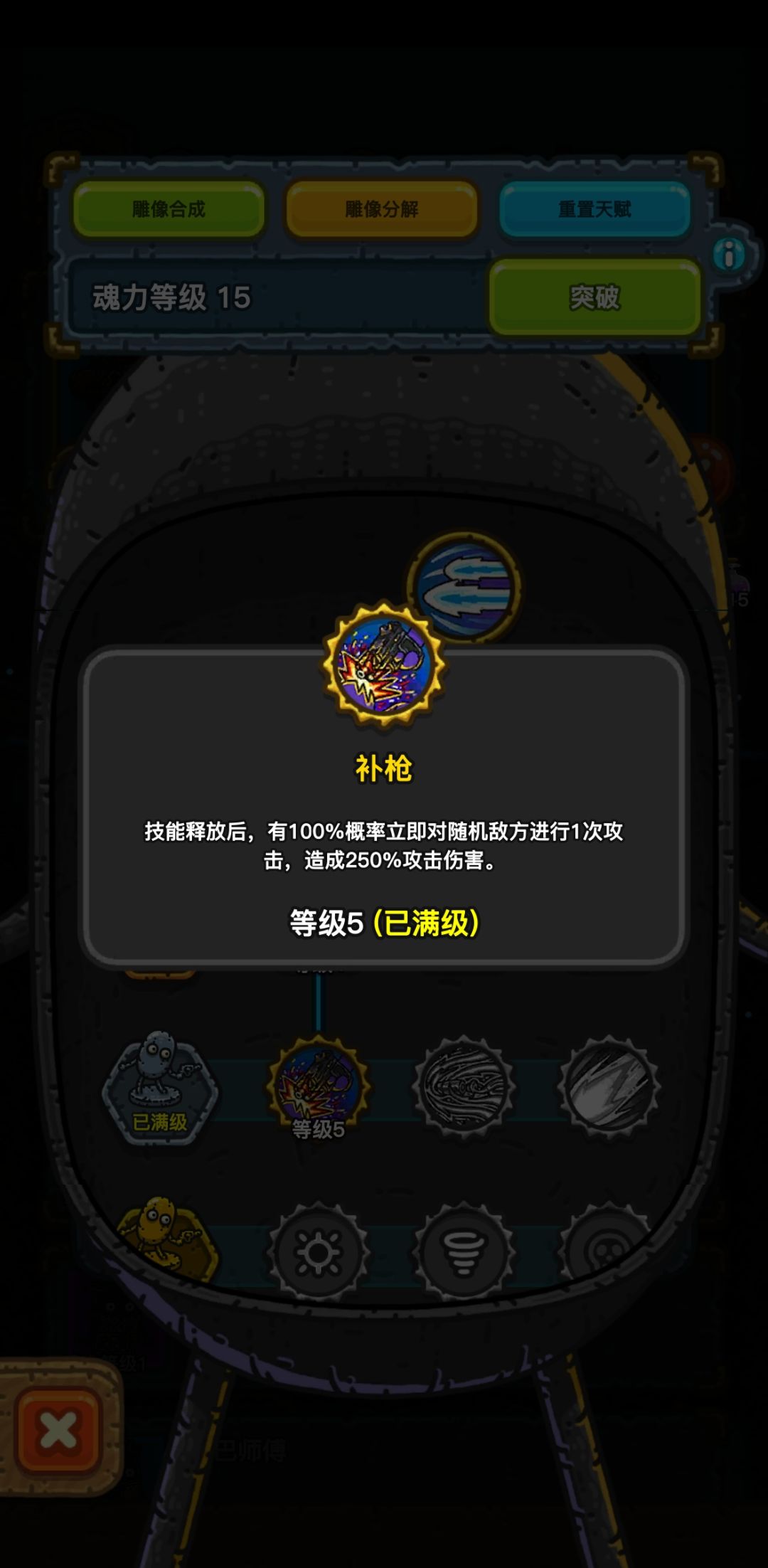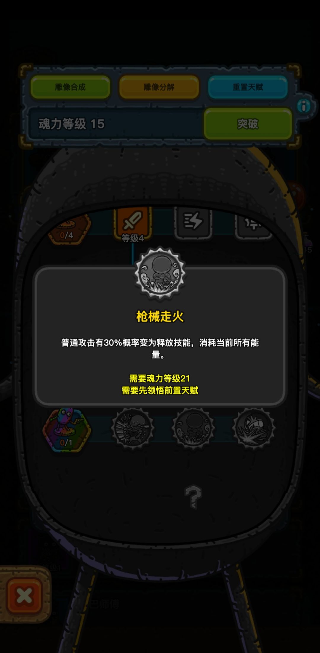 按照我自己的想法点的天赋,等级优先枪手和草丛,其中枪手按照我的加点法最高可以一回合放出两个技能,2下250%子弹也就是a-大招-腰射-补枪-大招-腰射-补枪一共8枪等到了21级可以点击枪械走火就是完美流程。要求一回合直接开大招就要带开局回复60%魂力的装备