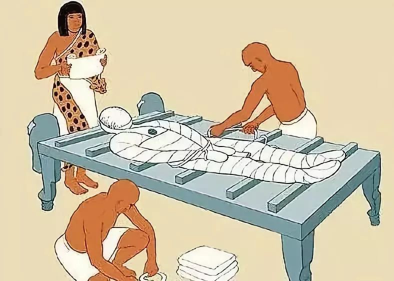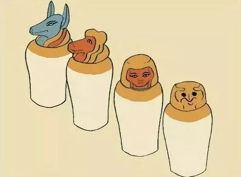 当然,制作木乃伊也有“高配”和“低配”版。费用昂贵,制作工艺复杂的适用于法老、达官贵人和富豪,对于普通人,只有把尸体表面用化学品处理,风干后用不同的油涂抹全身,再用麻布包裹起来。而“高配”版,则会有掏出内脏储存在陶罐中,化妆整形等复杂步骤(不具体描述了,有一点点重口)