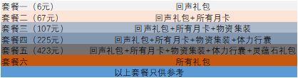 套餐二:回声礼包+所有月卡:月卡是天地劫性价比最高的(和其他游戏比也是),悔棋在前期开荒很重要,可以拿到一些贵重的宝箱,不至于再花费一次体力重新拿。