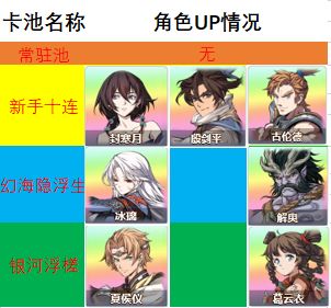 和开测一样,公测连上新手池和常驻池一共4个抽卡池、7个UP角色,均为绝品质(游戏最高品质角色)。新手池三个UP角色,两个限时活动池分别两个。下面是开服将会出的卡池。
