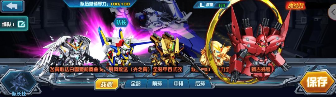 推荐理由:自V2光之翼问世,多模队的队长位置必属它了。战舰则选择新锐草薙号。V2光之翼、百式改、F91出力全开、新吉翁号、全装甲ZZ敢达再包括战舰草薙号都有为敌方机体增加出力不足状态的能力,非常合适触发百式改全装甲化增强技能的降低攻击频率的效果,可谓是天作之和。同时草薙号和新吉翁号添加护盾的能力能用来抵抗伤害,也能和百式的回复能力进行一定程度的衔接,可以让此队伍整体的站场能力大大提升。