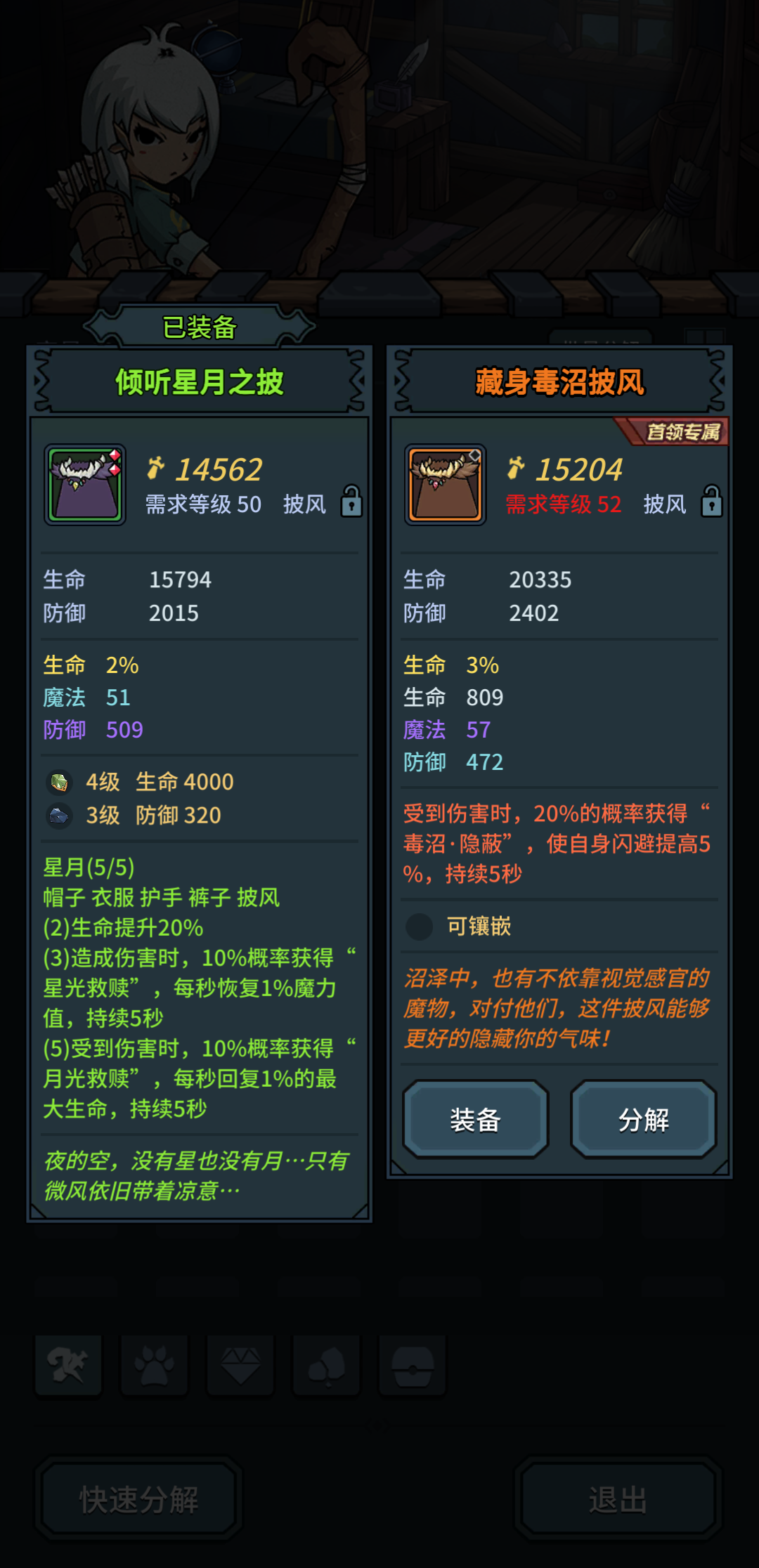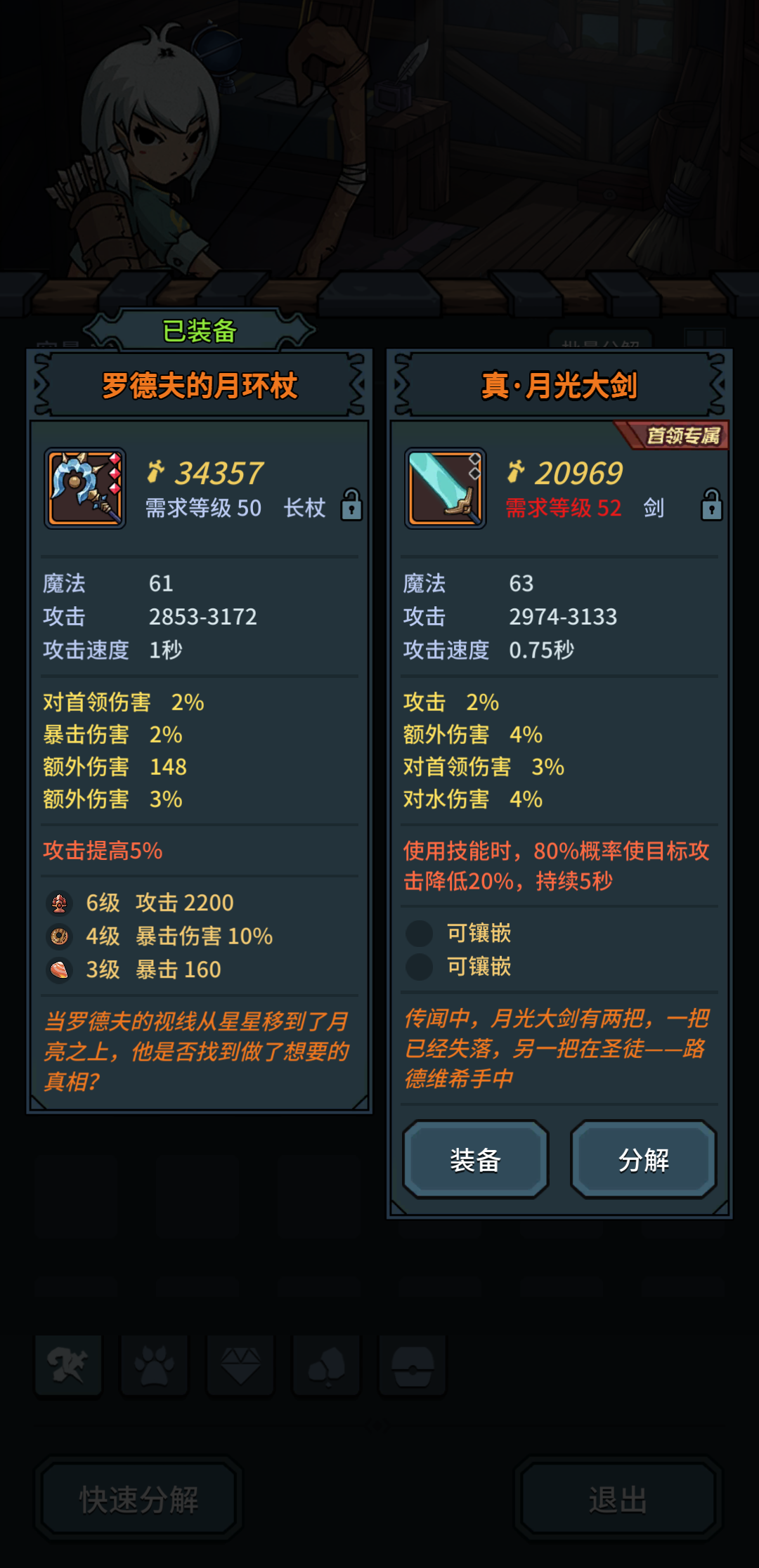 然后就是装备了,武器是真月光好吧?那套装呢?52级要不要换一下?把套装两件换成橙装?还是说都留着,爬高用橙色,升级用套装?在线等一个大佬