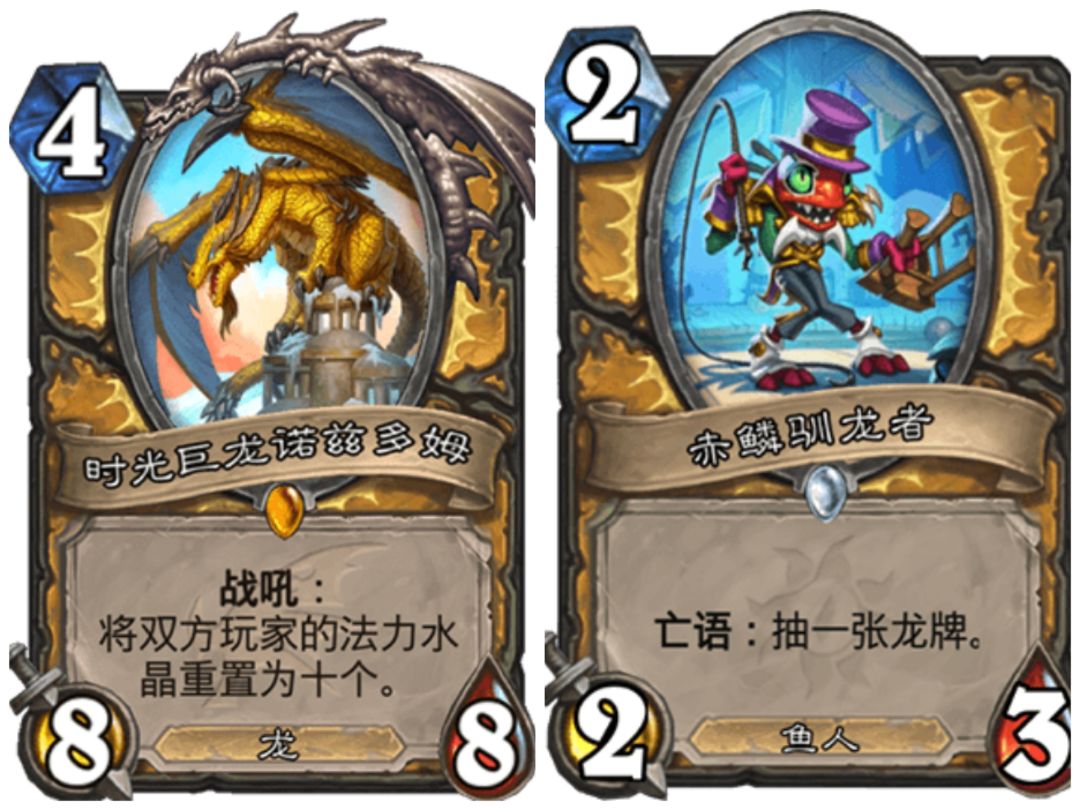 时光龙在这套牌中主要起提前启动的作用,且还有223鱼人这种定向检索可以顺带压缩牌库。使用方式通常为前期拍下时光龙然后下回合在对面手牌资源尚且不多的时候双开战斗号角铺满场,或者是上回合拍下时光龙下回合直接发牌员加元气弹打出一发高额斩杀。