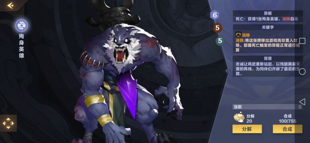 殉身英雄:狼人嘛,简直不死不灭,抓到他就永远不会缺部署,5-5挺合适的,能打能抗,6费就不太友好了,所以只带一张吧,反正多了也不能两张一起下。这货就是小强,就算被封印了也是进墓地,再复活依然可以无限回手,后期汲灵没目标了就选他吧,不奢侈。