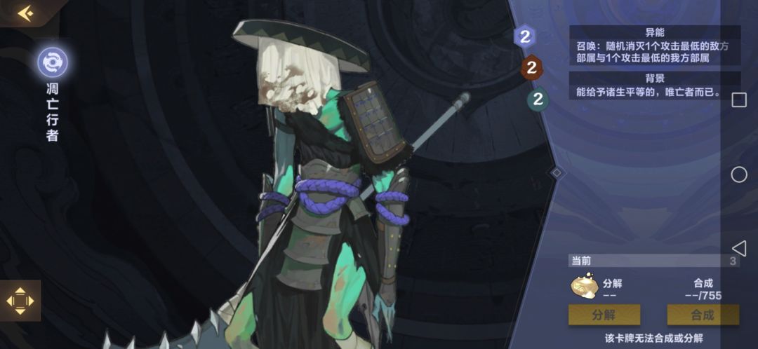 凋亡行者:简称砍头,阴卡组灵魂部署,满编!更像一个法术,大部分时间出来就是和对面换命的,2费2-2几乎不会亏。消灭是最霸道的异能,管你不屈啊还是法术免疫的(对,说的就是你青莲龙女),在砍头面前统统不好使。这张卡一定牢牢捏在手里,因为只会砍对面攻击最低的卡,遇到大哥落单直接丢上去,别乱砍。这也是我不带小先知的原因,经常把砍头乱招出来。