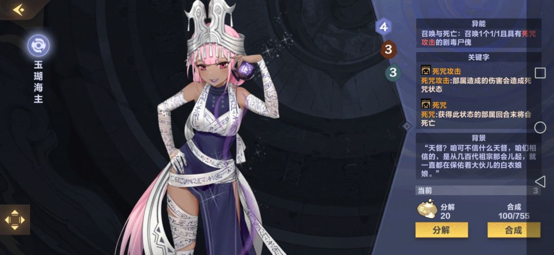 玉湖海主:快速铺场,毒尸固定召唤在最后面的空格,有一定的可控性,建议满编!如果砍头是主动换命,那海主就是被动换命,毒尸的死咒攻击和消灭差不多霸道,专杀大哥。海主自己的3-3身材对付快攻也绰绰有余。常常一卡能换对面三卡。