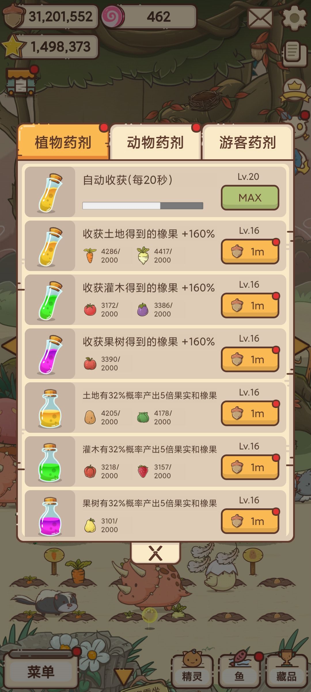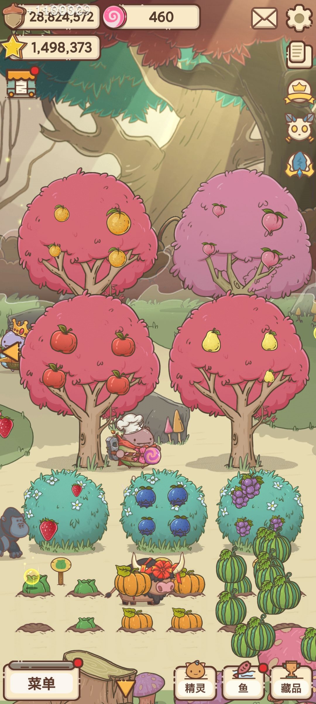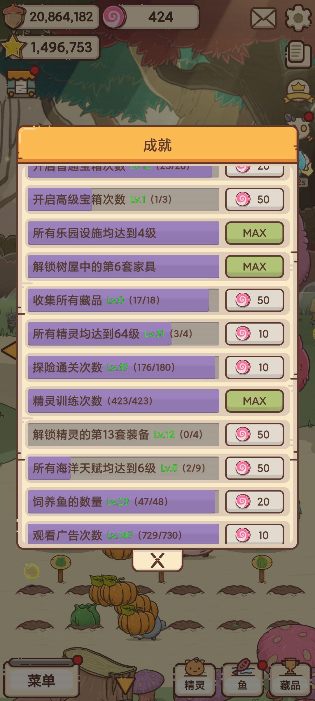 1、升级:需要大量果子,看广告能省很多等待果子数量的时间,能卡住广告出来的那一刻立马升级,能省很多很多果子,比如这颗果树需要24m,你只需要等果子有20m就有广告出来了,省了4m!!!(我是那种有广告了,但溢出来的果子就升级锅里的东西,要卡到刚好有广告出来那刻我才升级建筑)被广告恶心就对它抠到底,彻底利用!!一周内我都升的差不多了,快养老了,。 2 、还有一个赚糖果的,一次广告1百起糖果,就是打怪兽不要单指打,要四指五指一起打,但是打的太猛会有10%卡住黑屏,什么都没有得到。我一天糖果最多7、8千糖果(忘截图了,买鱼买家具用完了)!!!!只要肝要多少有多少。但只限没更新的前提下,更新后会有时看不了广告。还好我是今天才更新的。