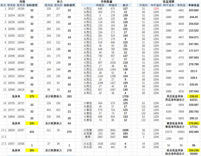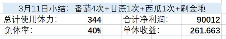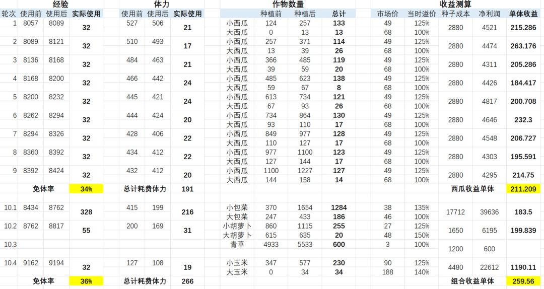 今天有作物榜,种了一会儿西瓜,平均单体收益211,总计耗费体力191,免体率34%。