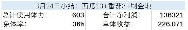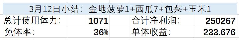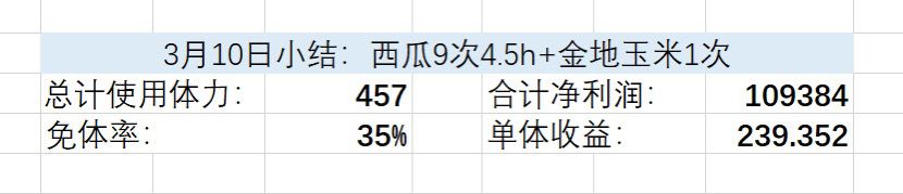 一下午西瓜+金地玉米,净赚109k,体力457,单体239。